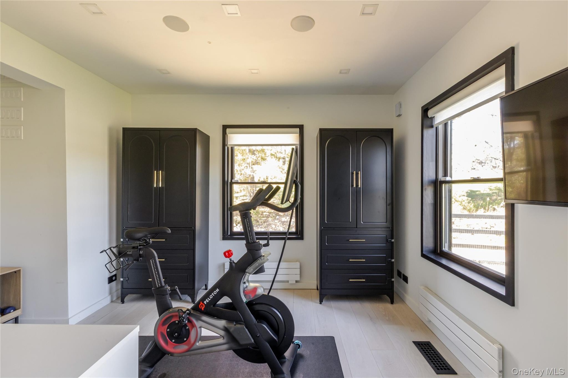 - Workout room featuring light wood-type flooring and radiator heating unit
