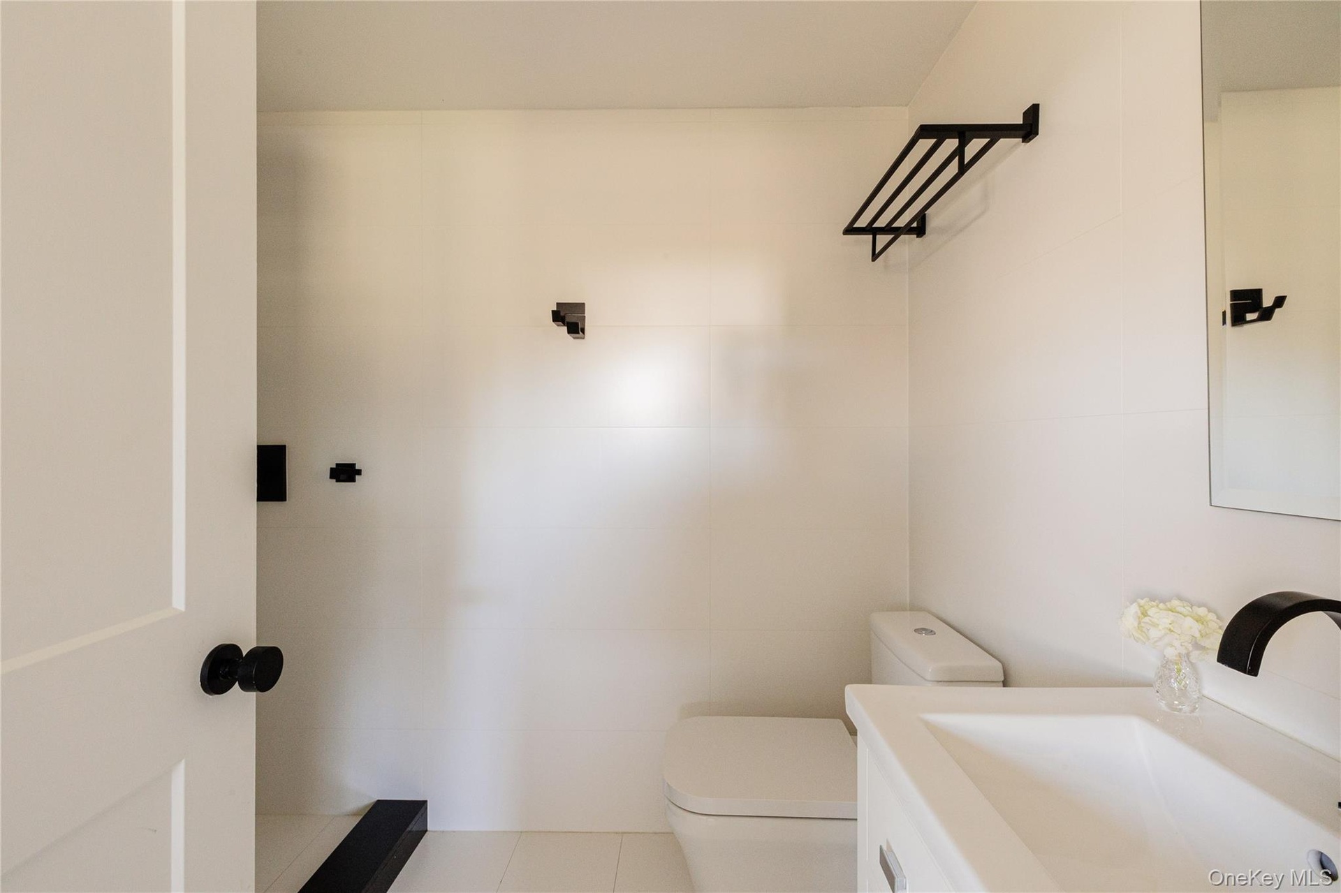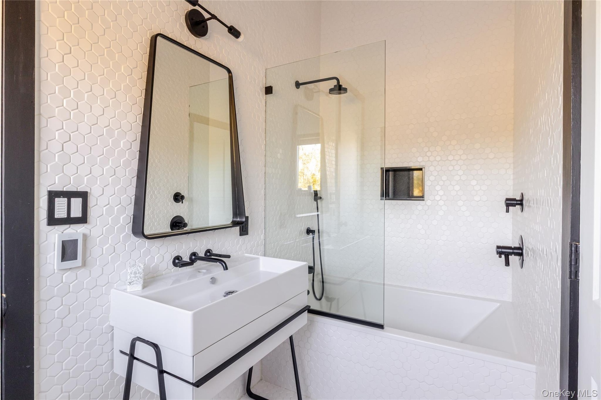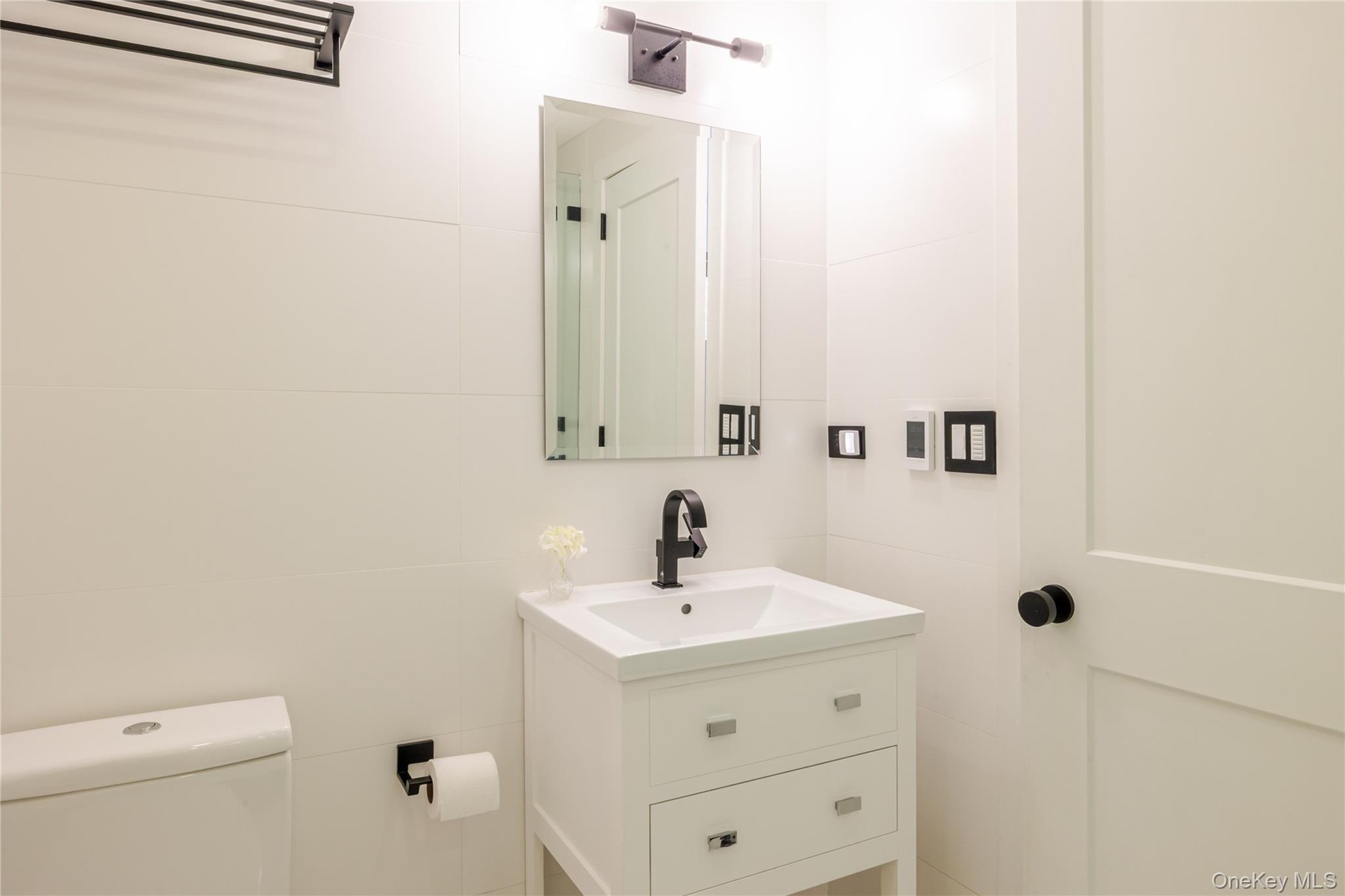 - Bathroom with tile walls, tile patterned flooring, and vanity