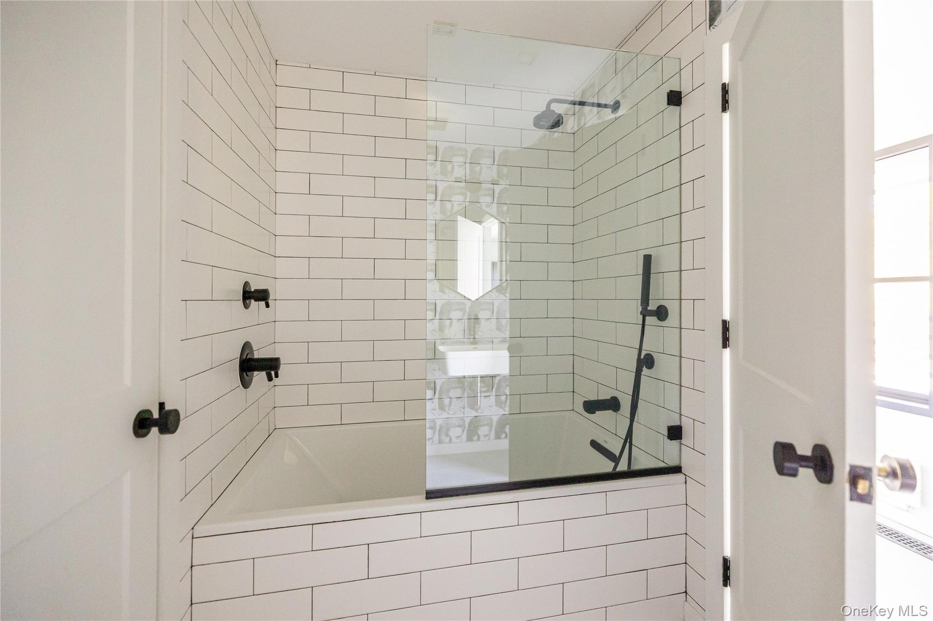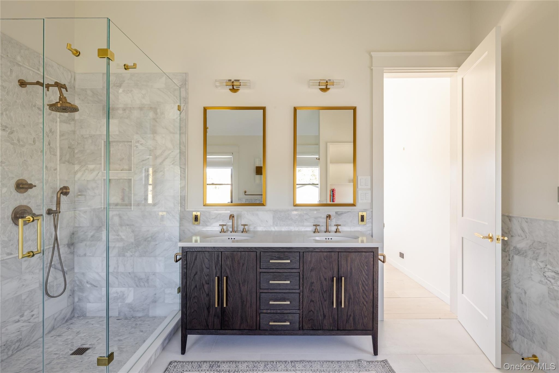 - Bathroom featuring a marble finish shower, double vanity, tile walls, and light tile patterned flooring