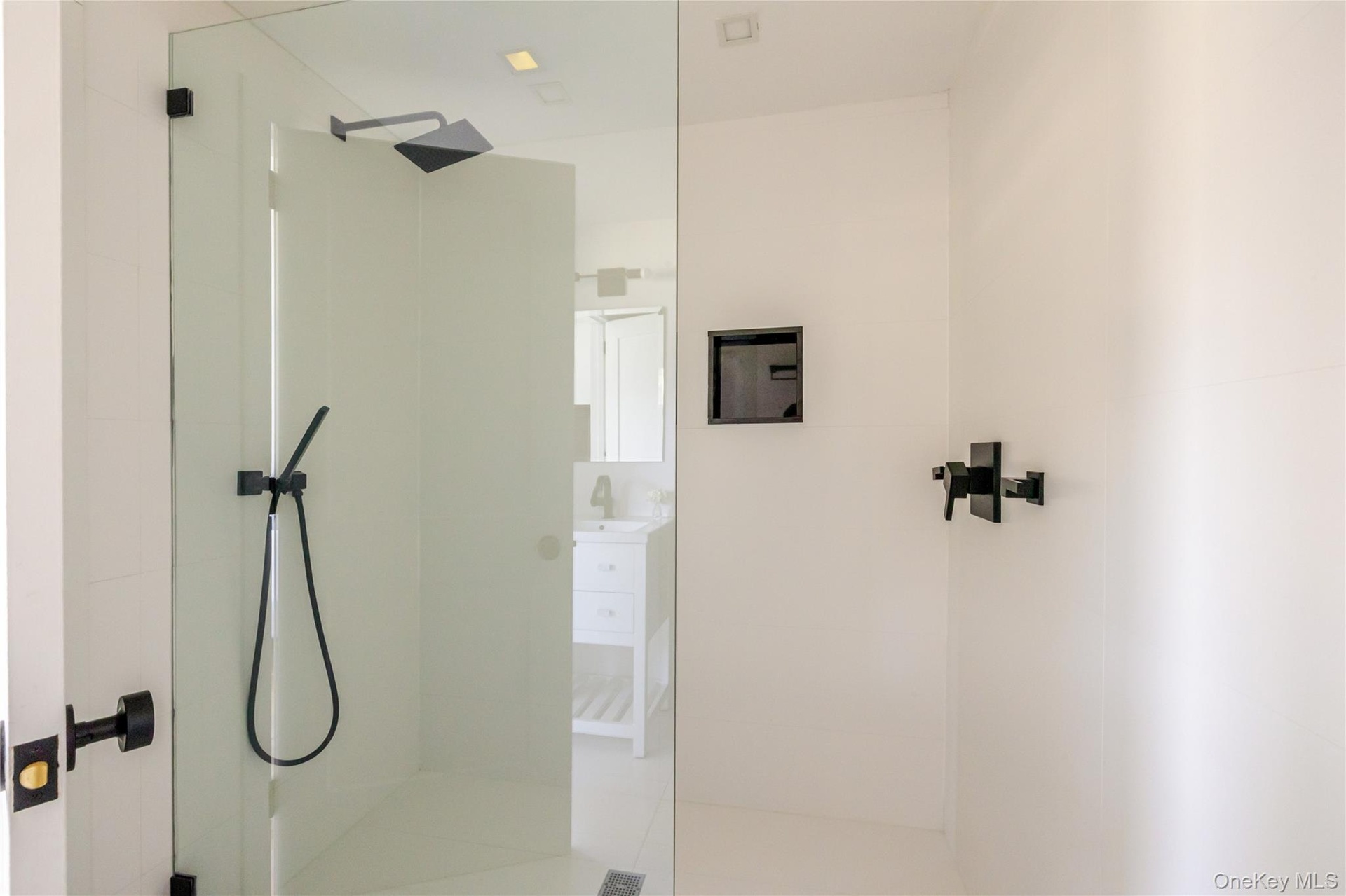- Bathroom with a walk in shower, vanity, and light tile patterned flooring