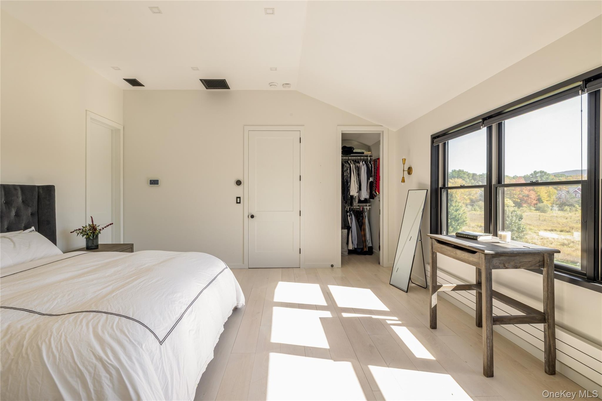 - Bedroom with vaulted ceiling, a spacious closet, and light wood-style flooring