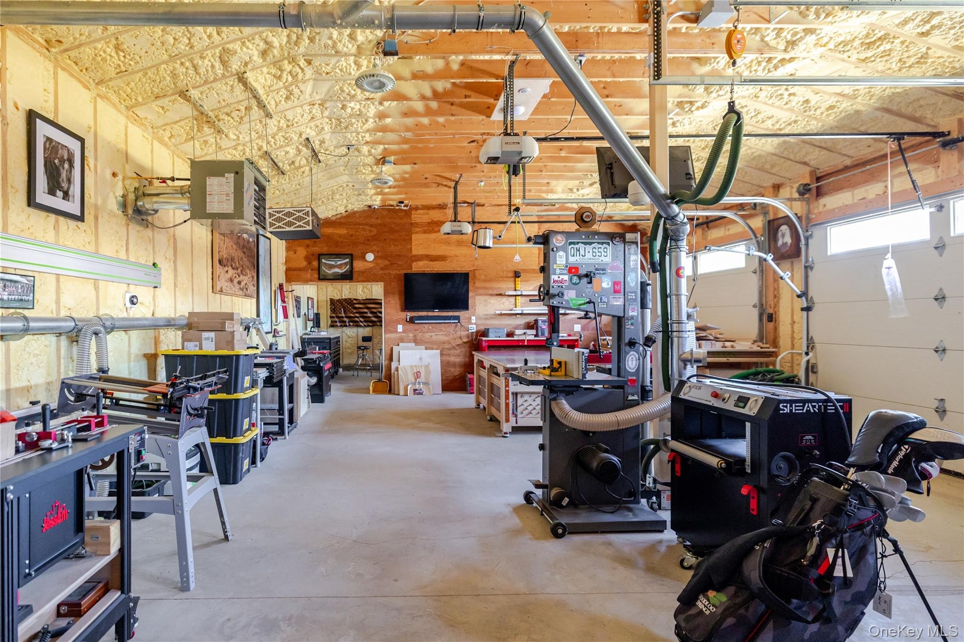- Garage featuring a workshop area, a heating unit, a garage door opener, and wooden walls