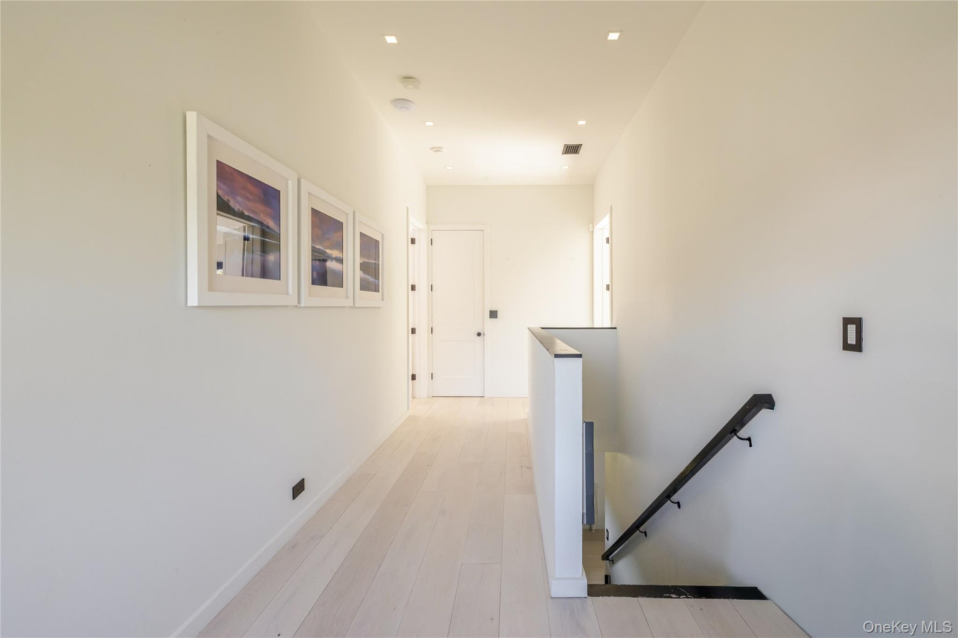 - Hall with an upstairs landing, light wood-style flooring, and recessed lighting