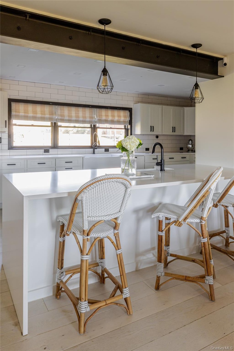 - Kitchen featuring a breakfast bar, decorative backsplash, white cabinets, hanging light fixtures, and light wood finished floors