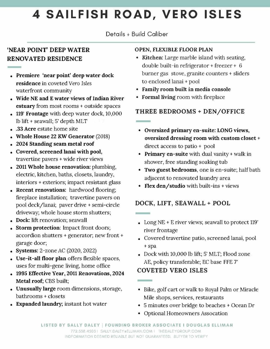 Vero's best move-in ready river buy under $2M! Deep water 'near point' lot w/dock, lift, seawall w/WIDE views + 2024 standing seam metal roof! 119' frontage! Modern seaside indoor/outdoor living! 2011 Reno: electric/plumbing, partial impact w/accordions + generator! Wood floors, travertine pool deck, paver drive. Flex plan: 3B+ den w/enormous island kitchen w/gas range; Walls of glass, LR w/FP. The ICW is your most prominent neighbor!X flood zone! Ideal Vero Isles locale: bike/golf cart to Royal Palm eateries, Miracle Mile across st! 5 mins to island, Ocean Dr!An absolute gem! Possible 2nd fl!Close