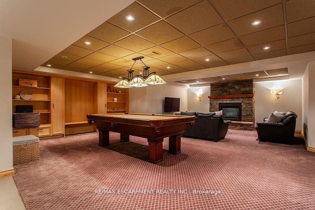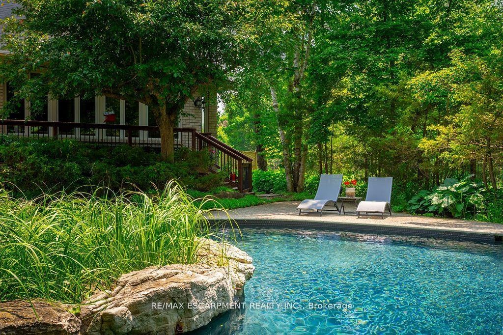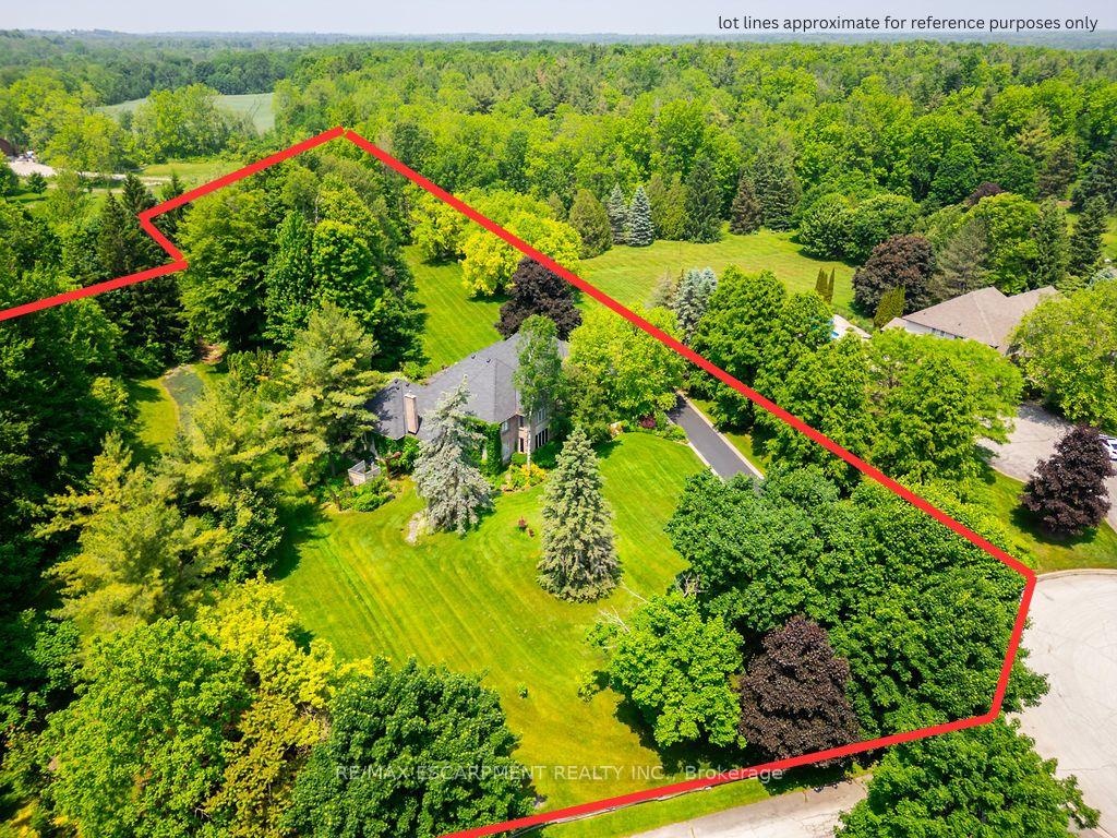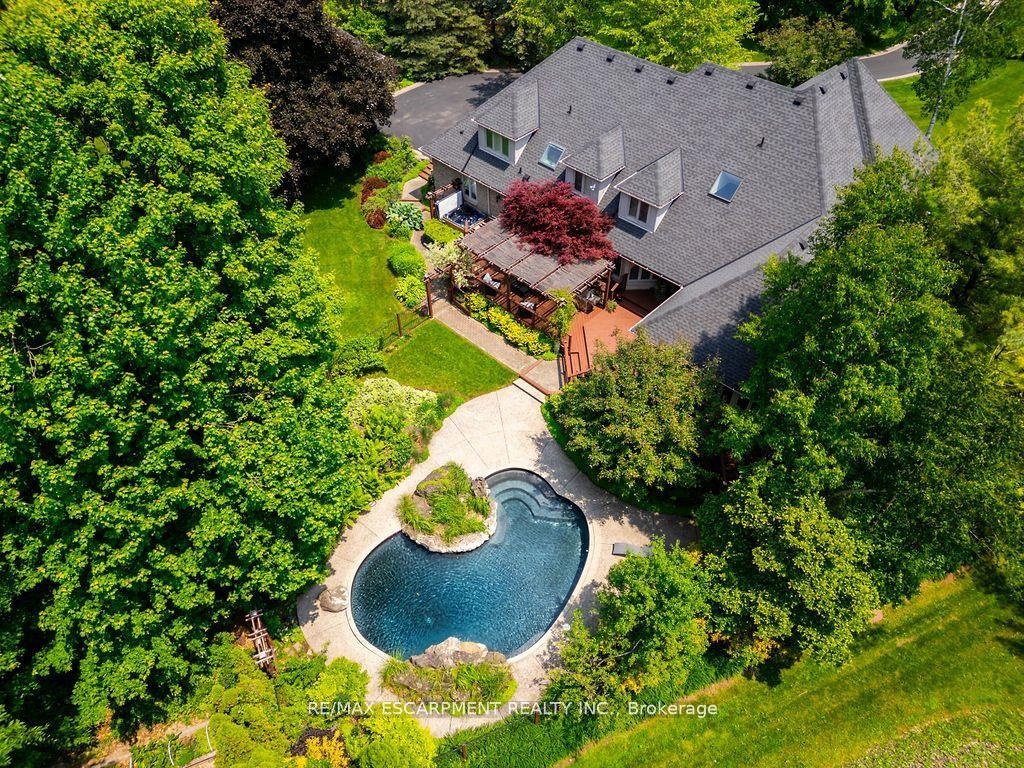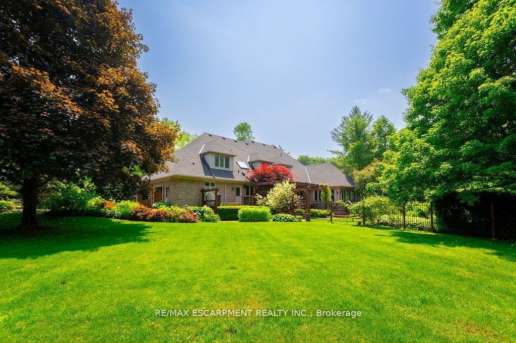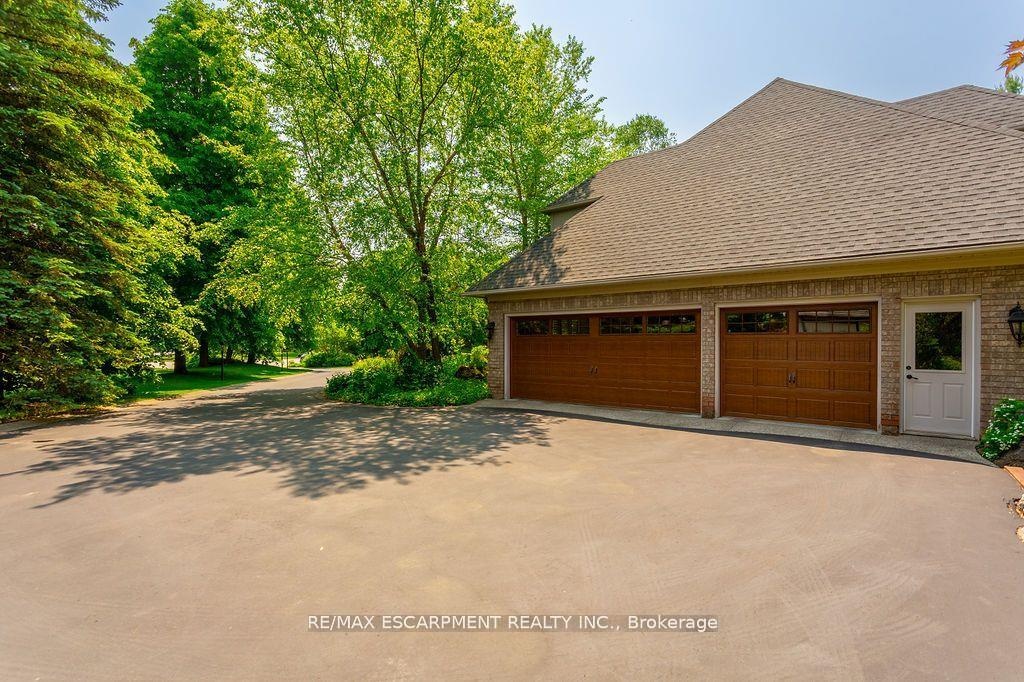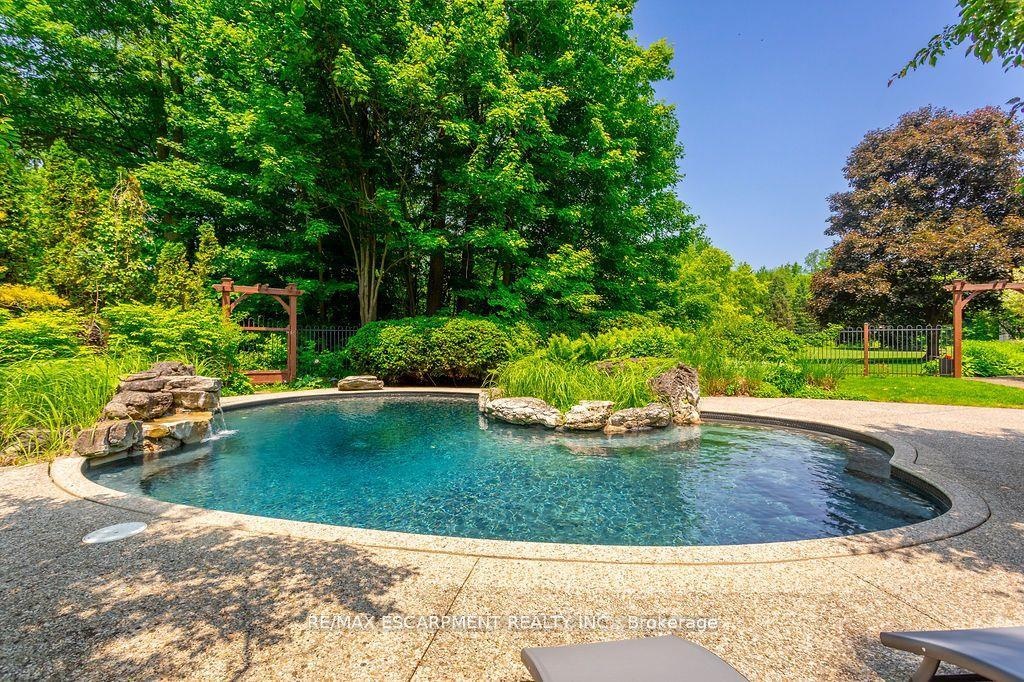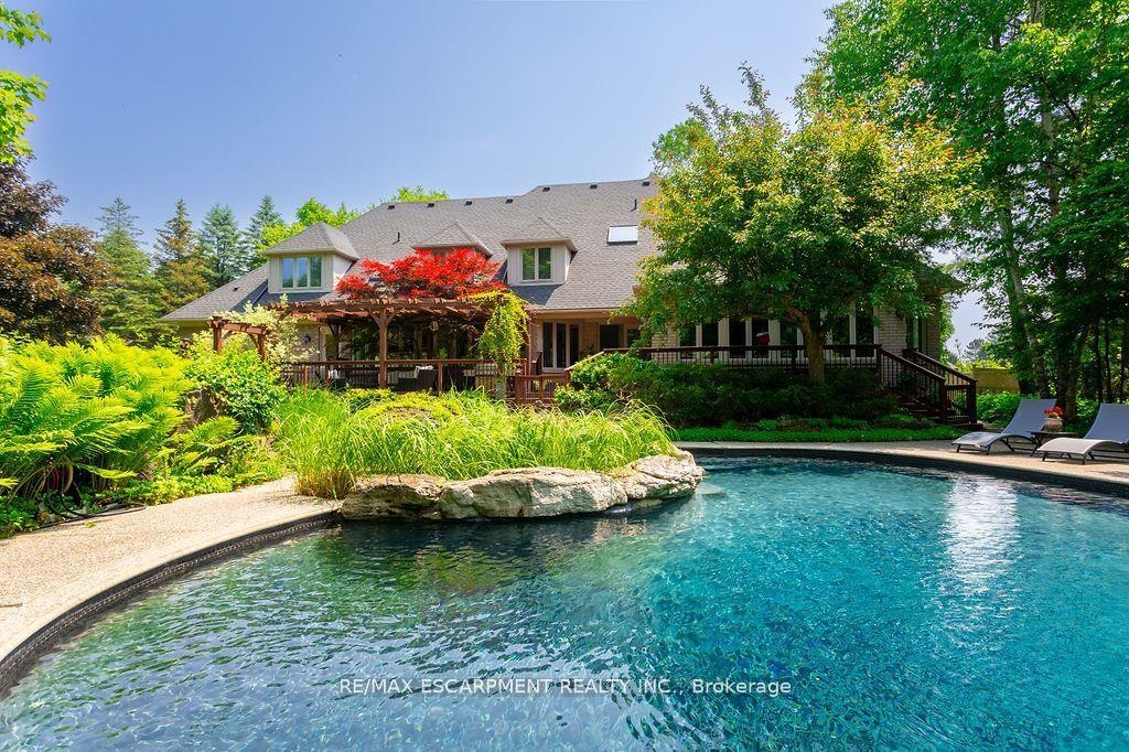 Welcome to 27 Blackberry Place a truly exceptional luxury estate nestled at the end of a prestigious cul-desac in the heart of Carlisle. Set on a sprawling and completely private 2.12-acre lot, this distinguished residence is enveloped by professionally landscaped grounds, featuring curated gardens and a winding driveway. This home offers over 7,791 sq ft, timeless design and modern refinement. The soaring two storey foyer welcomes you, flanked by a formal dining room perfect for hosting, richly appointed wood panelled library with gas fireplace. Light filled updated chefs kitchen with custom cabinetry, soft-close drawers, wood island, marble countertops, high-end appliances, and a generous breakfast room. A soaring great room with vaulted ceilings flows into an oversized sunroom offering panoramic views of the private backyard. Corner office on the main level provides a peaceful work-from-home retreat. The upper level offers a secondary library or office leading into the luxurious primary suite with a spa-inspired ensuite featuring a soaker tub, rain shower, and an expansive dressing room. Three additional spacious bedrooms and 5-piece bathroom complete the second level. The fully finished lower level is an entertainers haven and ideal for multigenerational living or nanny, featuring a private entrance, large recreation and games rooms with built-ins and a gas fireplace, a wet bar with ambient lighting and beverage fridge, a guest bedroom, spa-style bathroom with heated floors, and three oversized storage rooms. Step into the backyard and experience resort-style living. Saltwater gunite pool with cascading rock waterfall, hot tub, expansive deck with pergola, raised vegetable gardens and charming gazebo surrounded by mature trees and lush privacy and acreage. Additional features include an oversized 3 car garage with EV charging capabilities, new furnace (2024), new AC (2024), roof (2019), most appliances (2024). LUXURY CERTIFIED.