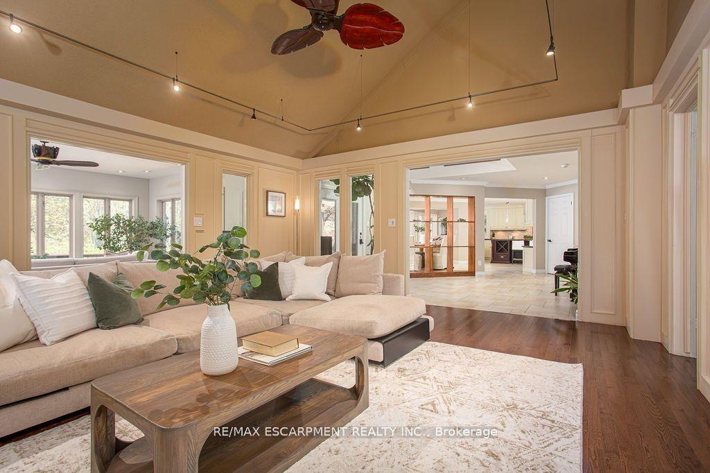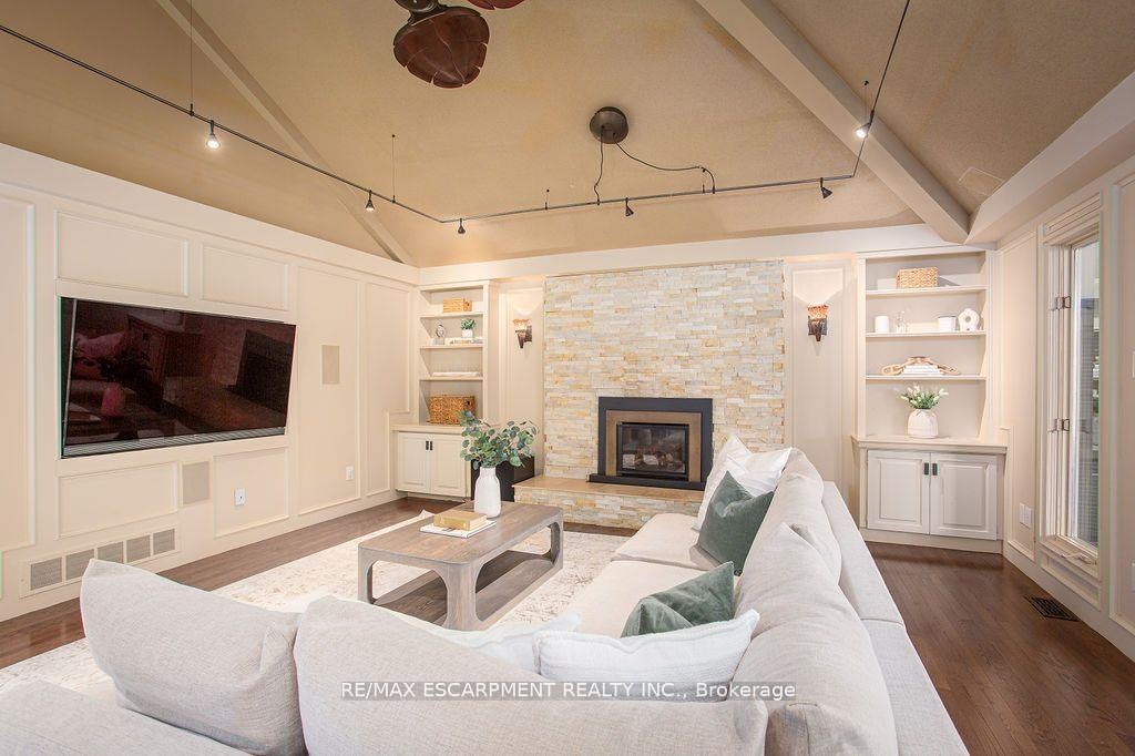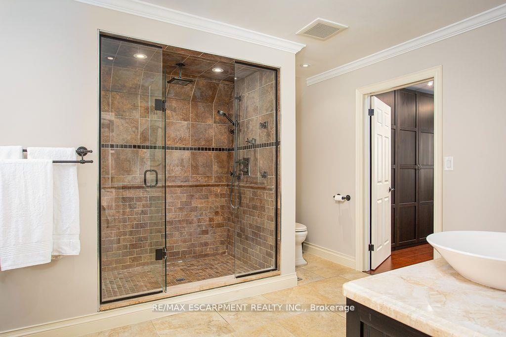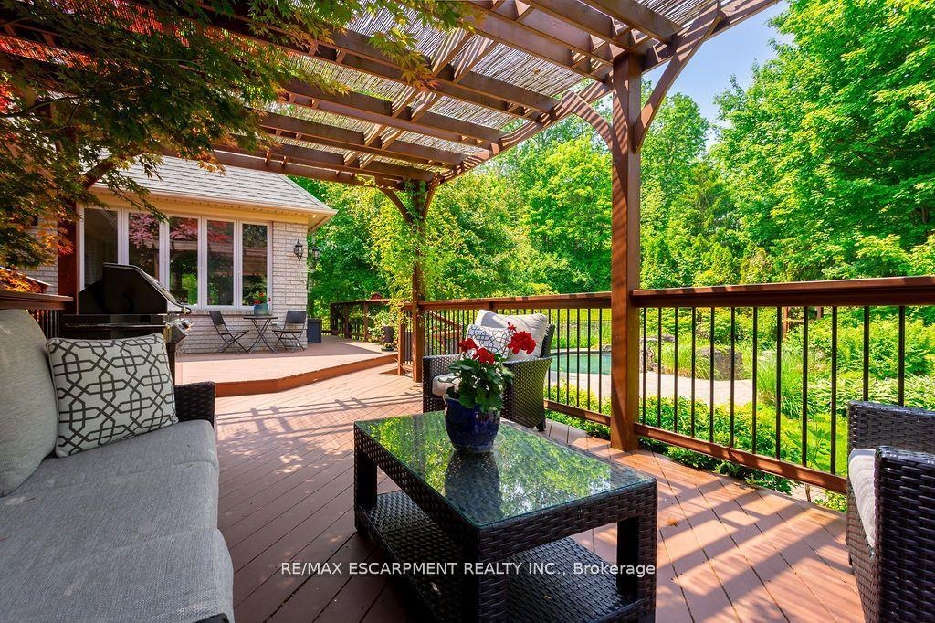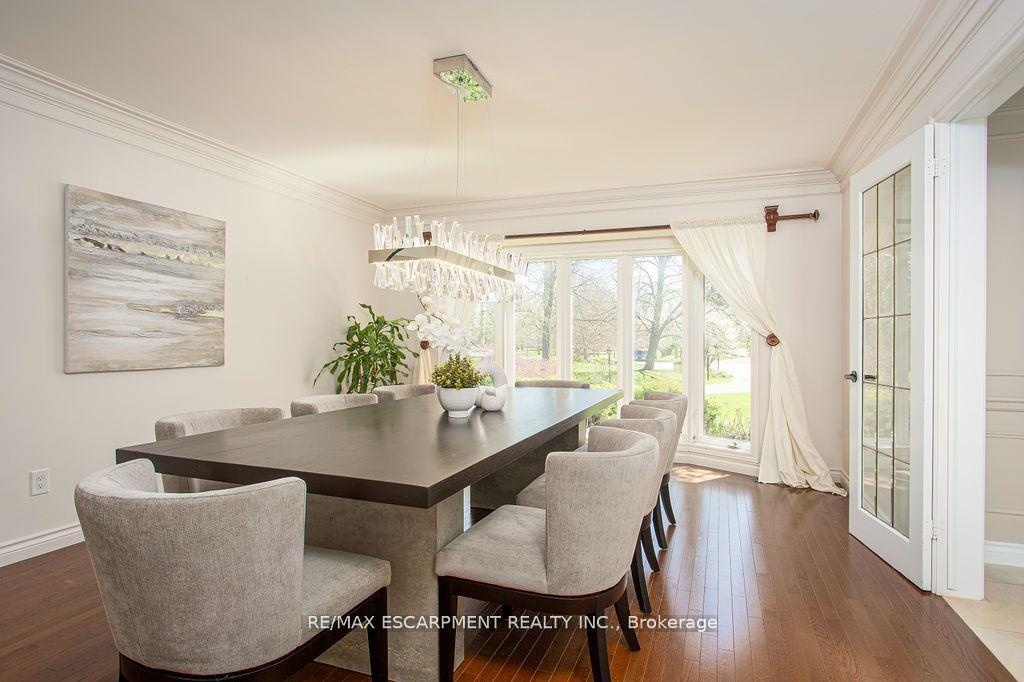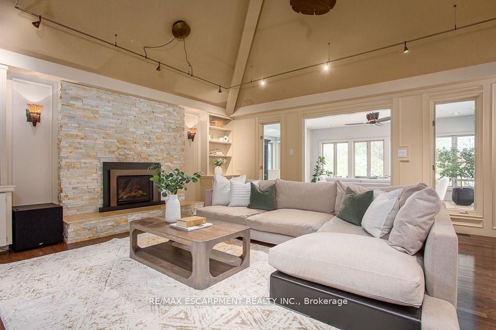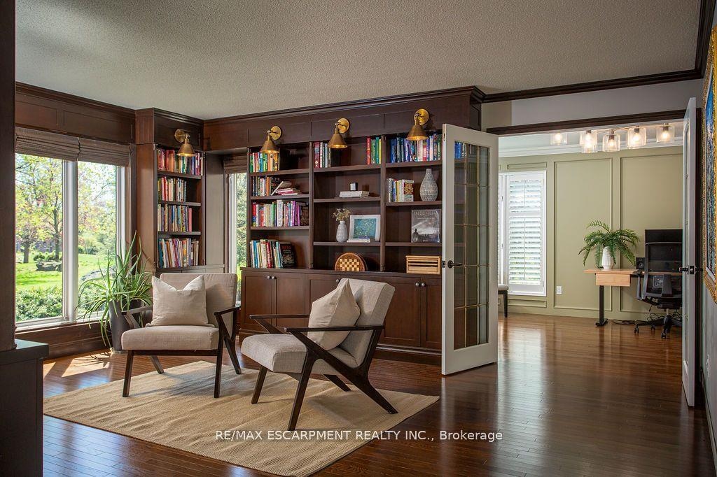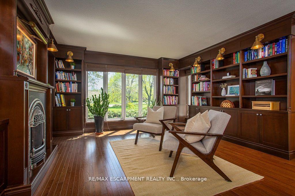Welcome to 27 Blackberry Place a truly exceptional luxury estate nestled at the end of a prestigious cul-desac in the heart of Carlisle. Set on a sprawling and completely private 2.12-acre lot, this distinguished residence is enveloped by professionally landscaped grounds, featuring curated gardens and a winding driveway. This home offers over 7,791 sq ft, timeless design and modern refinement. The soaring two storey foyer welcomes you, flanked by a formal dining room perfect for hosting, richly appointed wood panelled library with gas fireplace. Light filled updated chefs kitchen with custom cabinetry, soft-close drawers, wood island, marble countertops, high-end appliances, and a generous breakfast room. A soaring great room with vaulted ceilings flows into an oversized sunroom offering panoramic views of the private backyard. Corner office on the main level provides a peaceful work-from-home retreat. The upper level offers a secondary library or office leading into the luxurious primary suite with a spa-inspired ensuite featuring a soaker tub, rain shower, and an expansive dressing room. Three additional spacious bedrooms and 5-piece bathroom complete the second level. The fully finished lower level is an entertainers haven and ideal for multigenerational living or nanny, featuring a private entrance, large recreation and games rooms with built-ins and a gas fireplace, a wet bar with ambient lighting and beverage fridge, a guest bedroom, spa-style bathroom with heated floors, and three oversized storage rooms. Step into the backyard and experience resort-style living. Saltwater gunite pool with cascading rock waterfall, hot tub, expansive deck with pergola, raised vegetable gardens and charming gazebo surrounded by mature trees and lush privacy and acreage. Additional features include an oversized 3 car garage with EV charging capabilities, new furnace (2024), new AC (2024), roof (2019), most appliances (2024). LUXURY CERTIFIED.