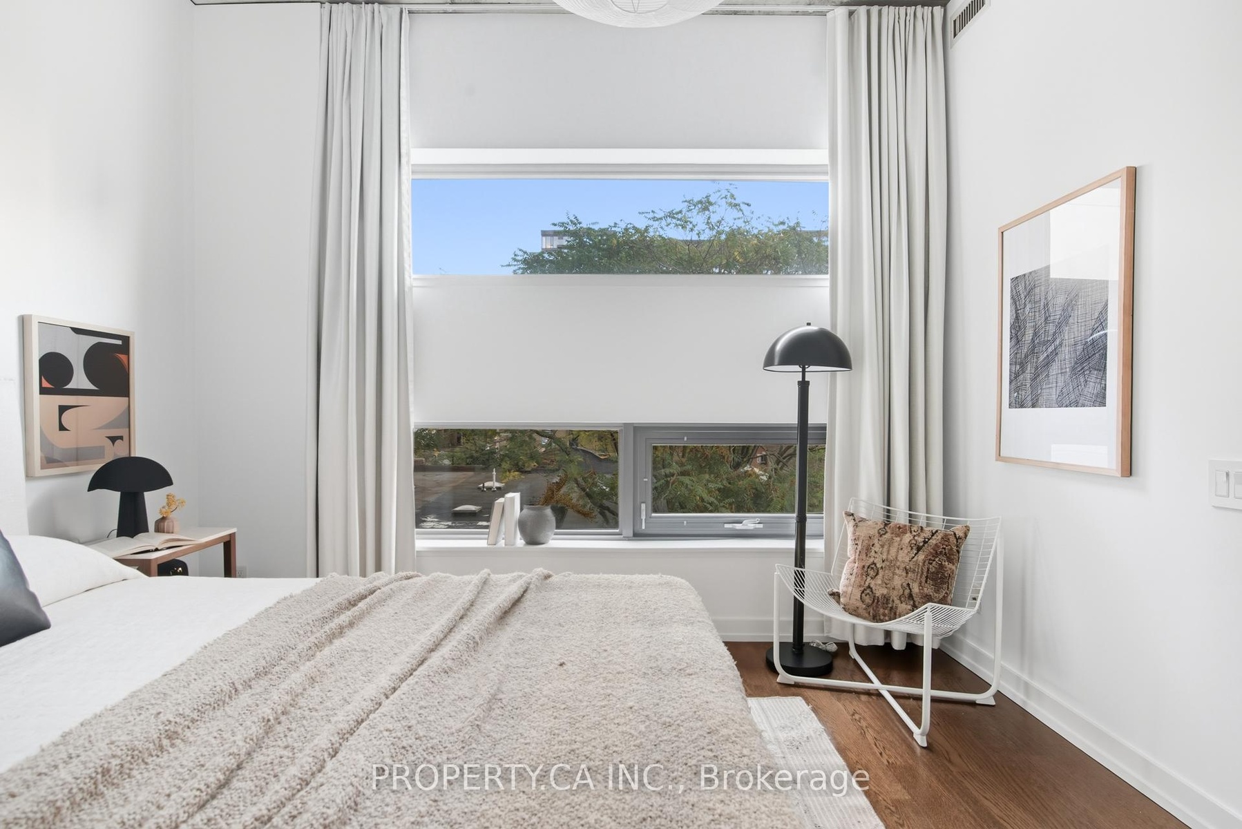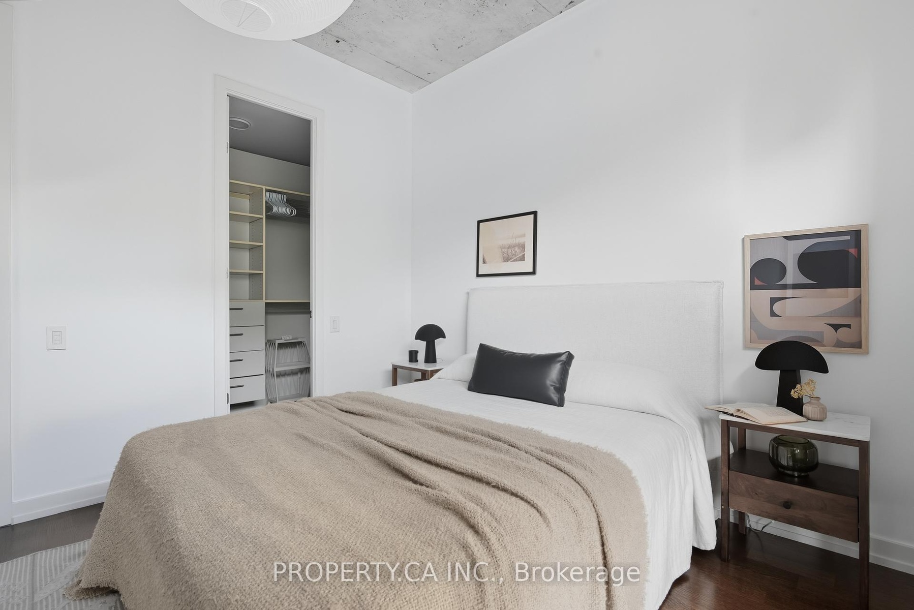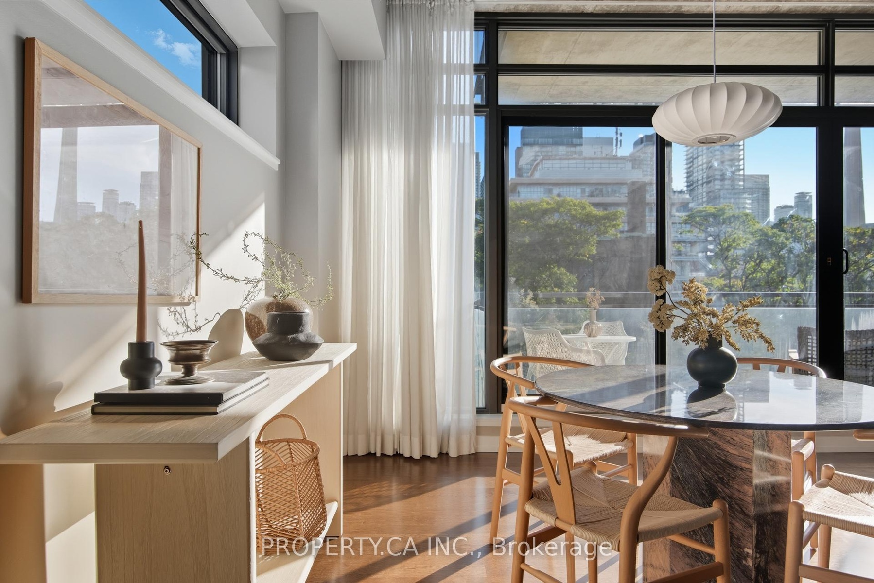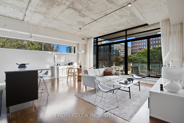 A rare opportunity to own in the coveted Fashion District Lofts! Tucked away in one of Toronto's most sought-after boutique buildings in the heart of King West. A stylish 2 bedroom, 2-bath suite offering almost 1,100sf of sleek, open-concept living. Enjoy 10ft concrete ceilings, floor-to-ceiling windows, and a bright, airy layout perfect for both relaxing and entertaining. The gourmet kitchen features high-end finishes and integrated appliances, while the spacious living area flows seamlessly to a private balcony with CN tower views. Enjoy low maintenance fees in an immaculately maintained building. Premium underground parking next to the elevator and locker included. Ideally situated on a quiet street just steps from Waterworks, Othership, the best restaurants, cafes and shops that King West has to offer, and transit at your door! This unit offers the perfect blend of urban convenience and boutique living, don't miss it!