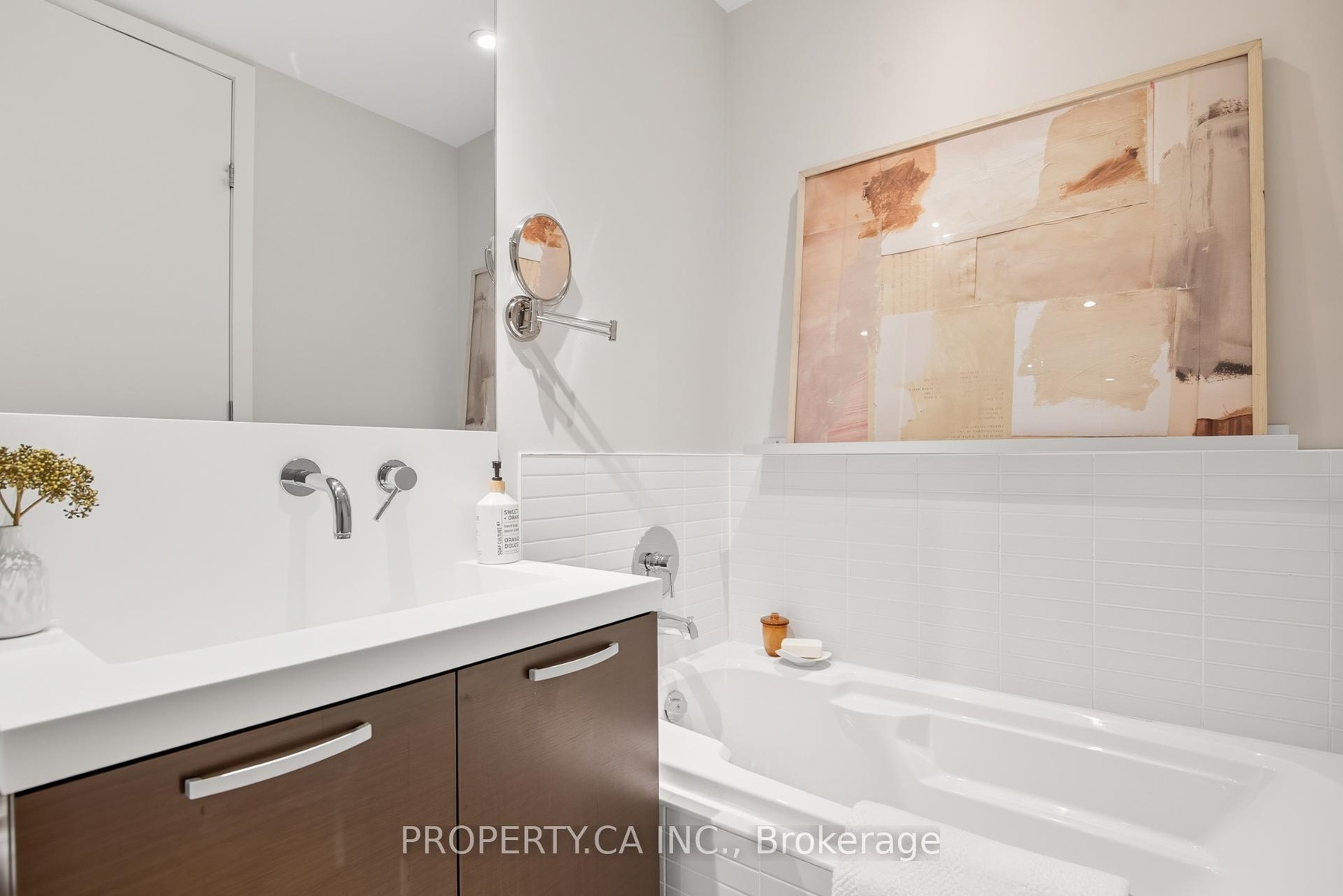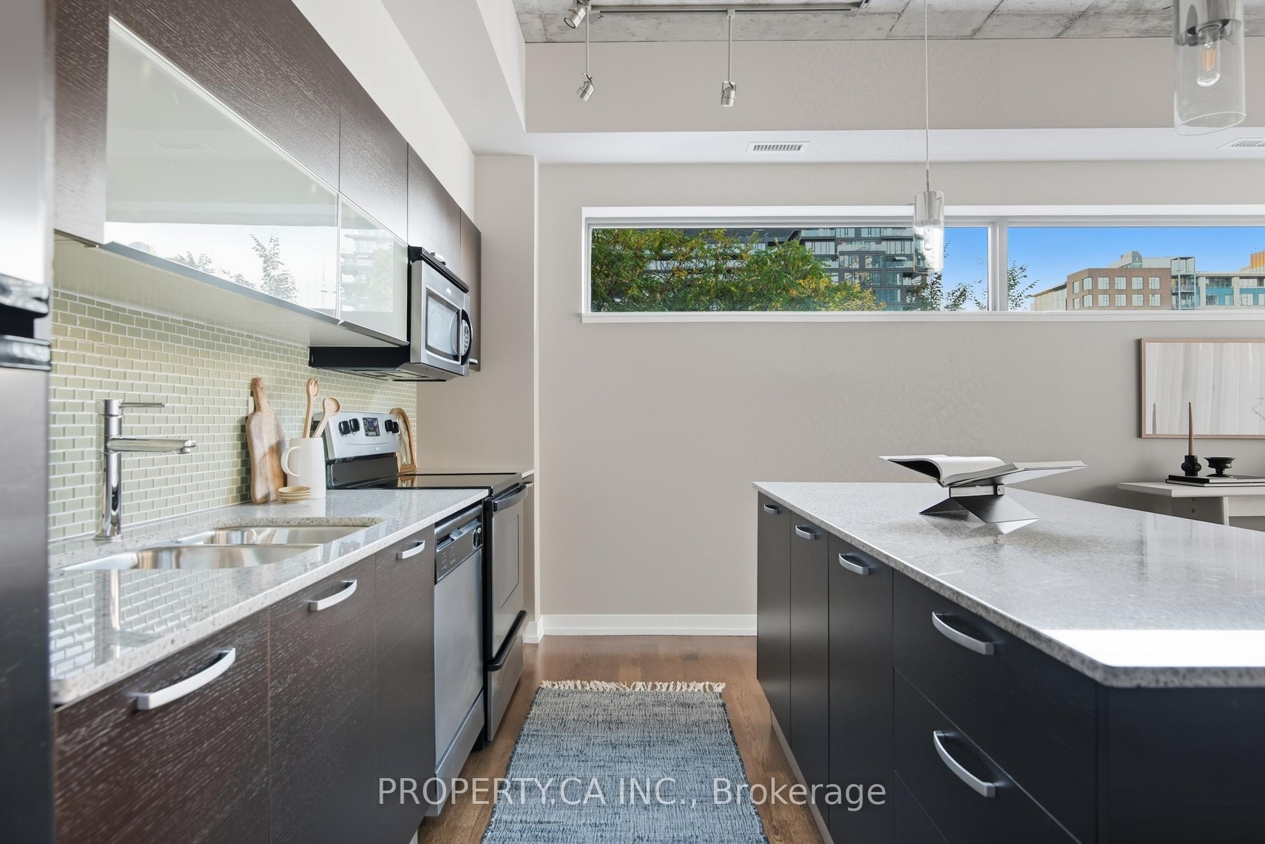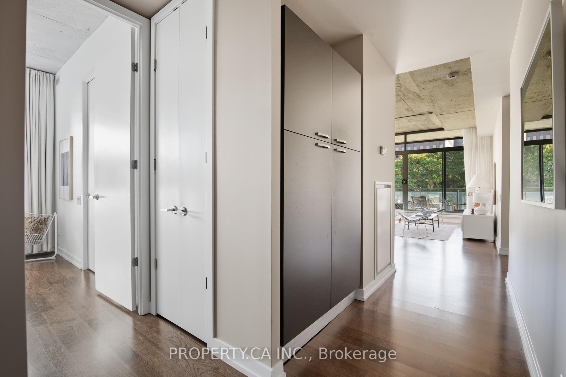 A rare opportunity to own in the coveted Fashion District Lofts! Tucked away in one of Toronto's most sought-after boutique buildings in the heart of King West. A stylish 2 bedroom, 2-bath suite offering almost 1,100sf of sleek, open-concept living. Enjoy 10ft concrete ceilings, floor-to-ceiling windows, and a bright, airy layout perfect for both relaxing and entertaining. The gourmet kitchen features high-end finishes and integrated appliances, while the spacious living area flows seamlessly to a private balcony with CN tower views. Enjoy low maintenance fees in an immaculately maintained building. Premium underground parking next to the elevator and locker included. Ideally situated on a quiet street just steps from Waterworks, Othership, the best restaurants, cafes and shops that King West has to offer, and transit at your door! This unit offers the perfect blend of urban convenience and boutique living, don't miss it!