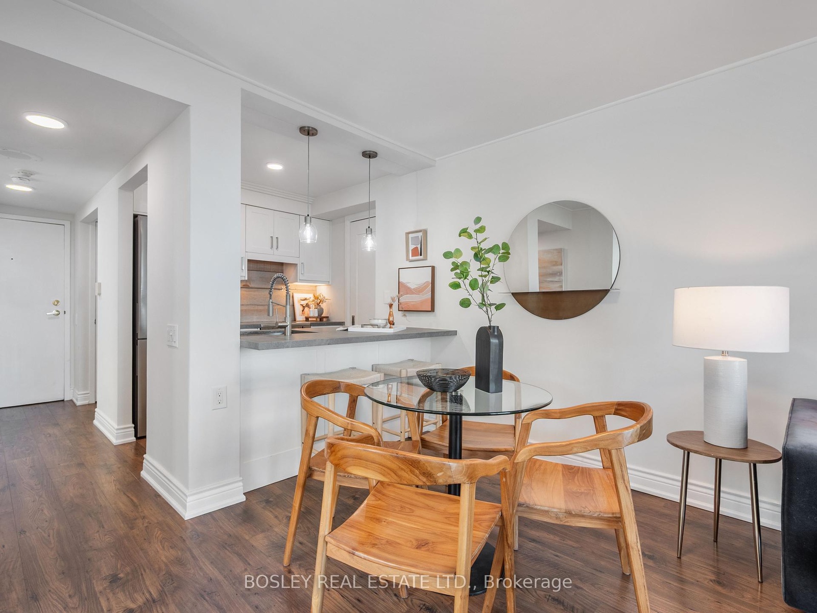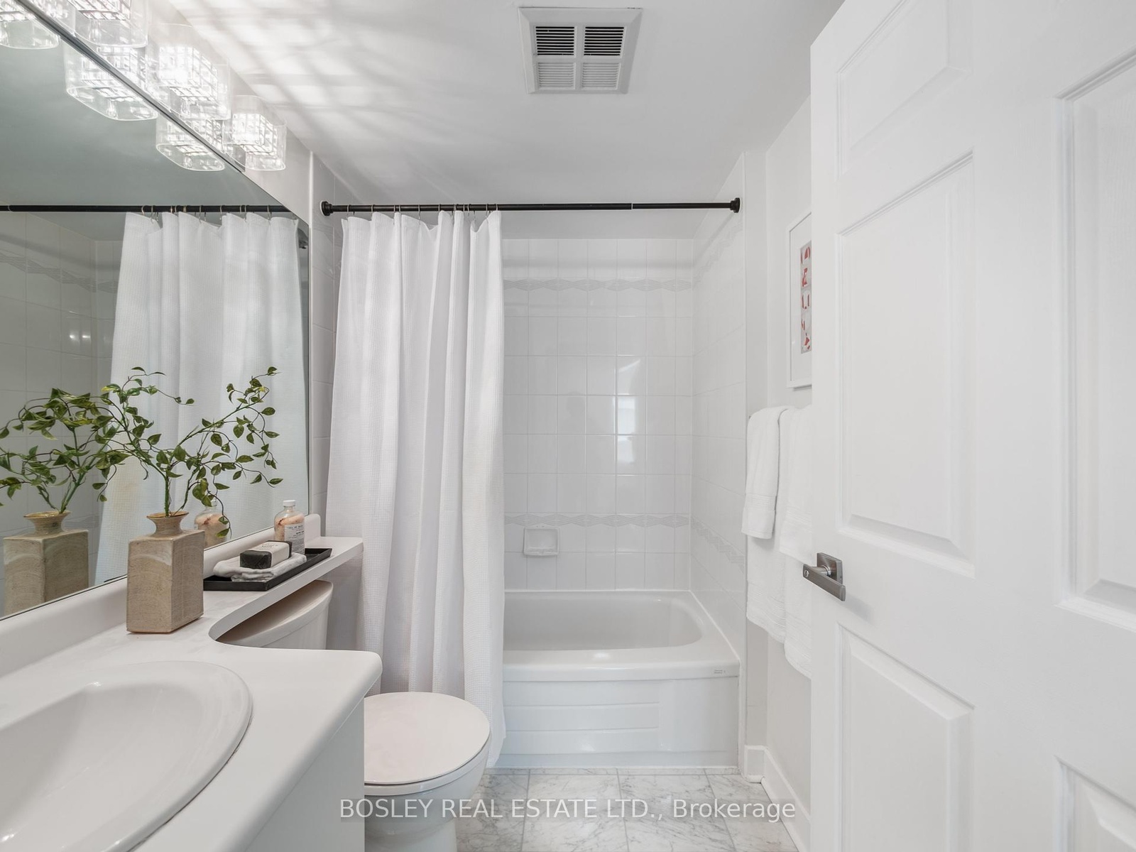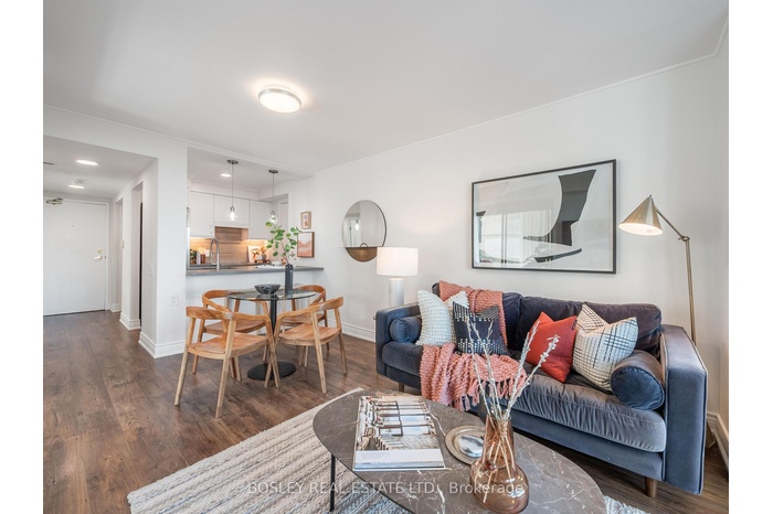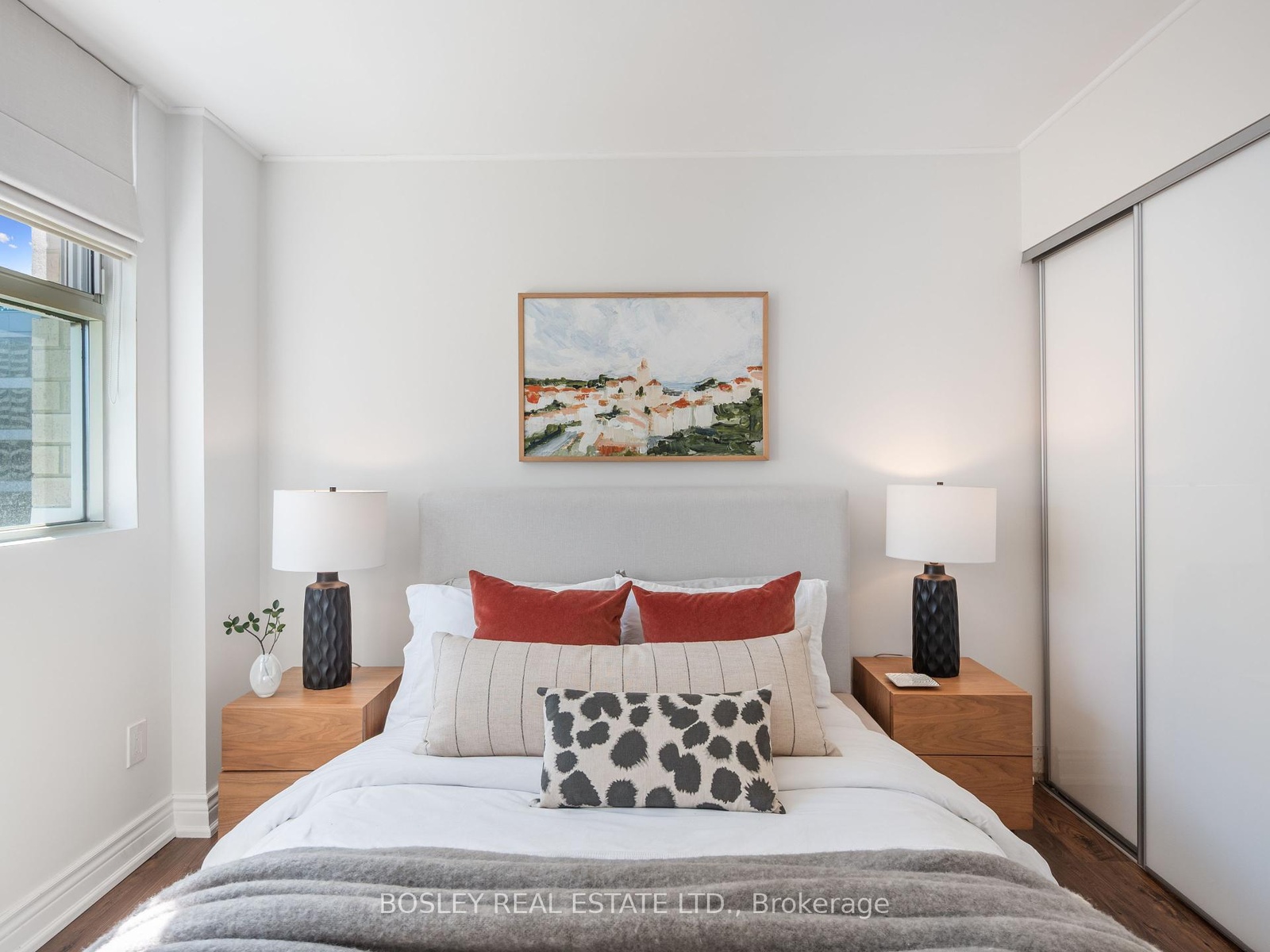 Welcome to The Rosedale! Nestled in a boutique condo of just 23 suites, this bright corner unit offers a 1 bedroom + large den layout, with the den easily working as a second bedroom or home office. The suite has been beautifully maintained and thoughtfully upgraded, featuring a renovated kitchen with wood detail backsplash and concrete-style countertops, wide plank laminate flooring, custom window coverings, and an oversized bedroom with double closets and custom inserts. East-facing windows flood the space with natural light throughout the day. And the location can't be beat! Just steps to TTC, Yonge and Bloor, Yorkville, shops, restaurants, and easy access to the DVP.