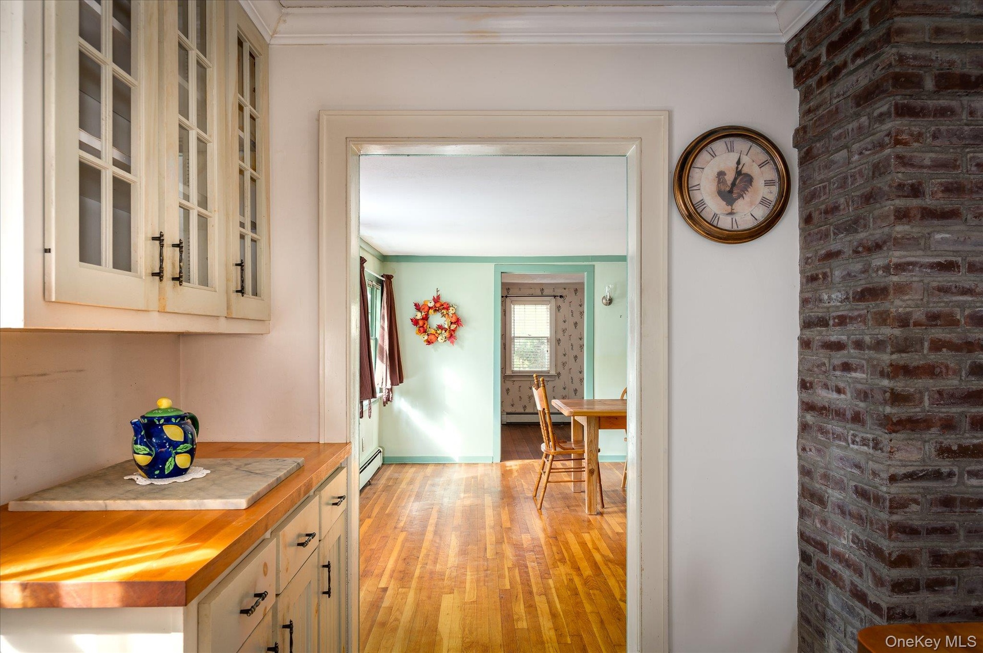 The farmhouse combines timeless warmth with subtle sophistication. A brick entryway sets the tone for craftsmanship that continues throughout. The kitchen pairs rustic charm with everyday function, featuring exposed brick accents, built-in cabinetry, and a butcher block island that invites gathering and morning coffee. A first-floor bedroom and full bath offer convenience, while the upper bedroom and bath provide a private retreat beneath gentle eaves.