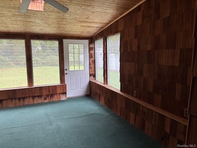 - Unfurnished sunroom featuring vaulted ceiling and a ceiling fan