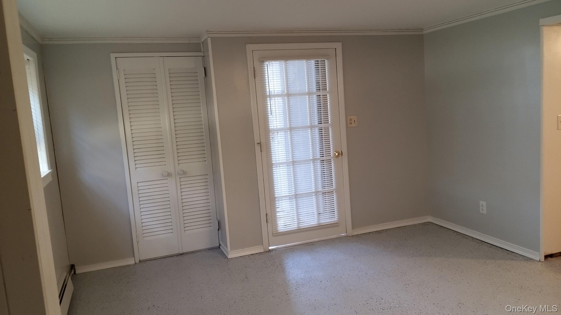 - Doorway to outside featuring ornamental molding and a baseboard heating unit