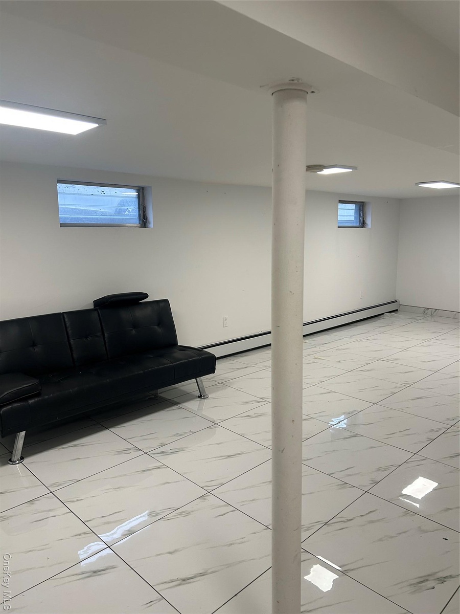 - Below grade area featuring a baseboard heating unit and light marble finish flooring