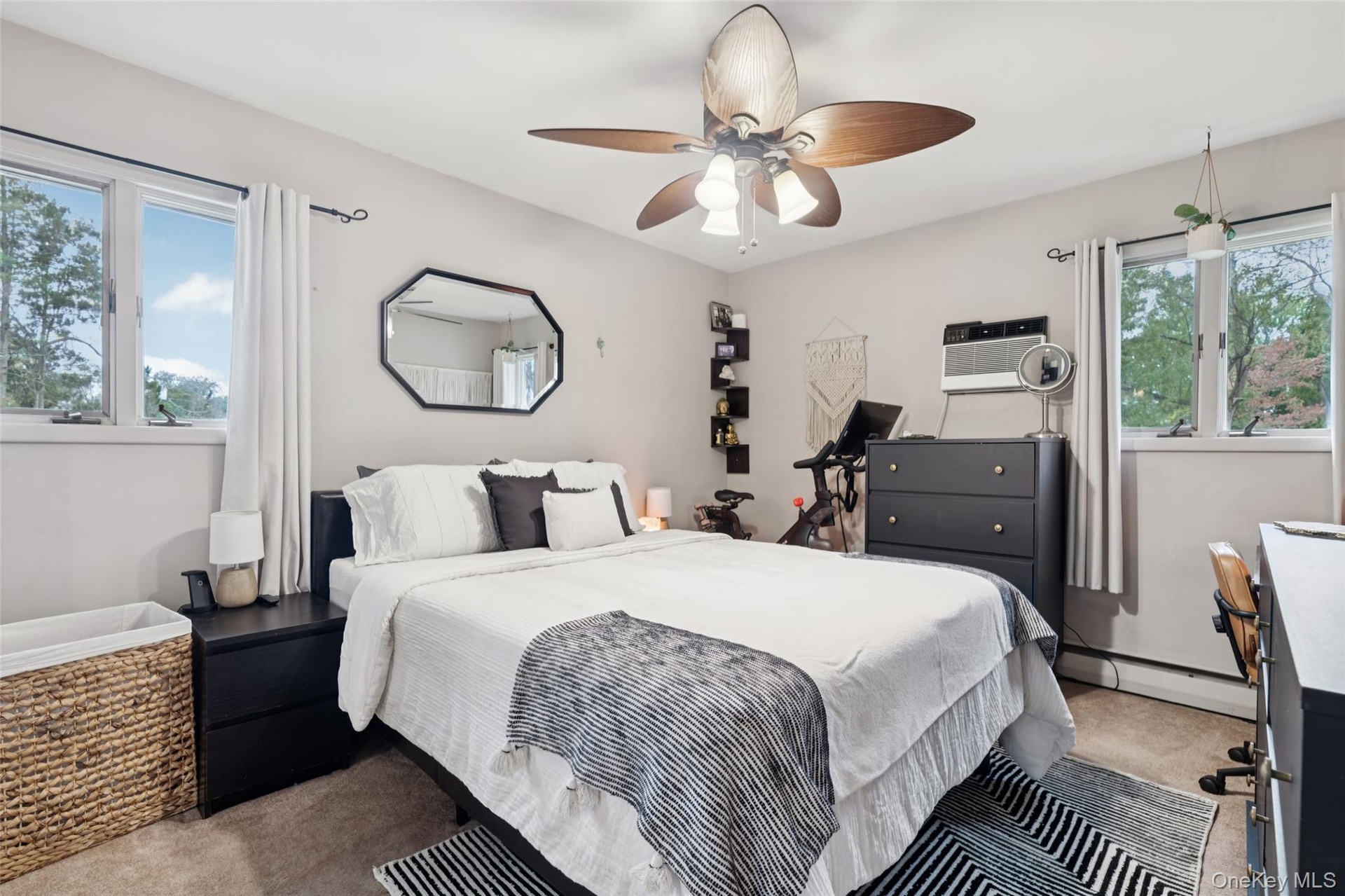 - Bedroom with carpet flooring, baseboard heating, ceiling fan, and a wall mounted air conditioner