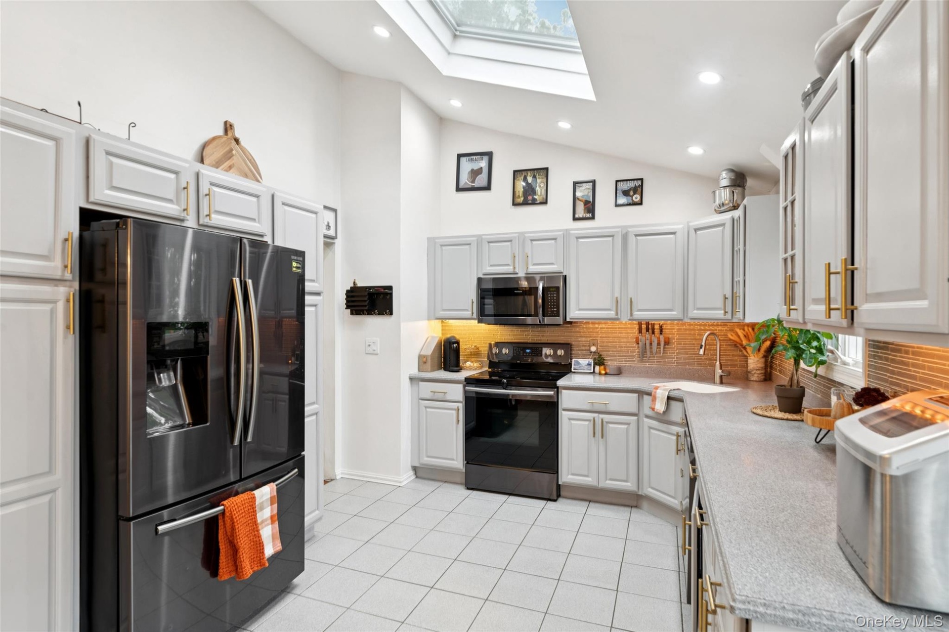 - Kitchen featuring appliances with stainless steel finishes, a skylight, glass insert cabinets, tasteful backsplash, and light tile patterned flooring