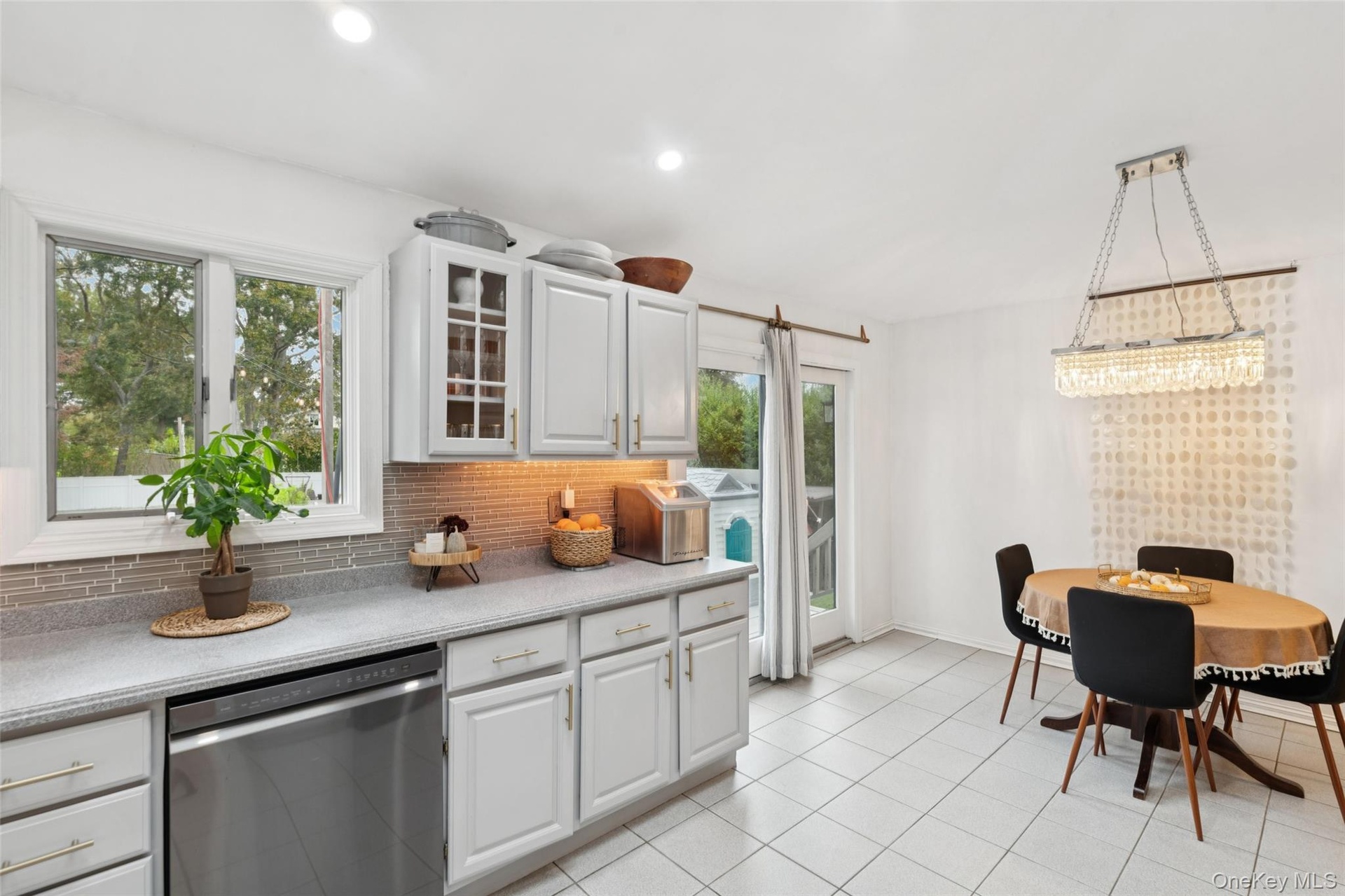 - Kitchen featuring dishwasher, glass insert cabinets, tasteful backsplash, white cabinetry, and light tile patterned floors