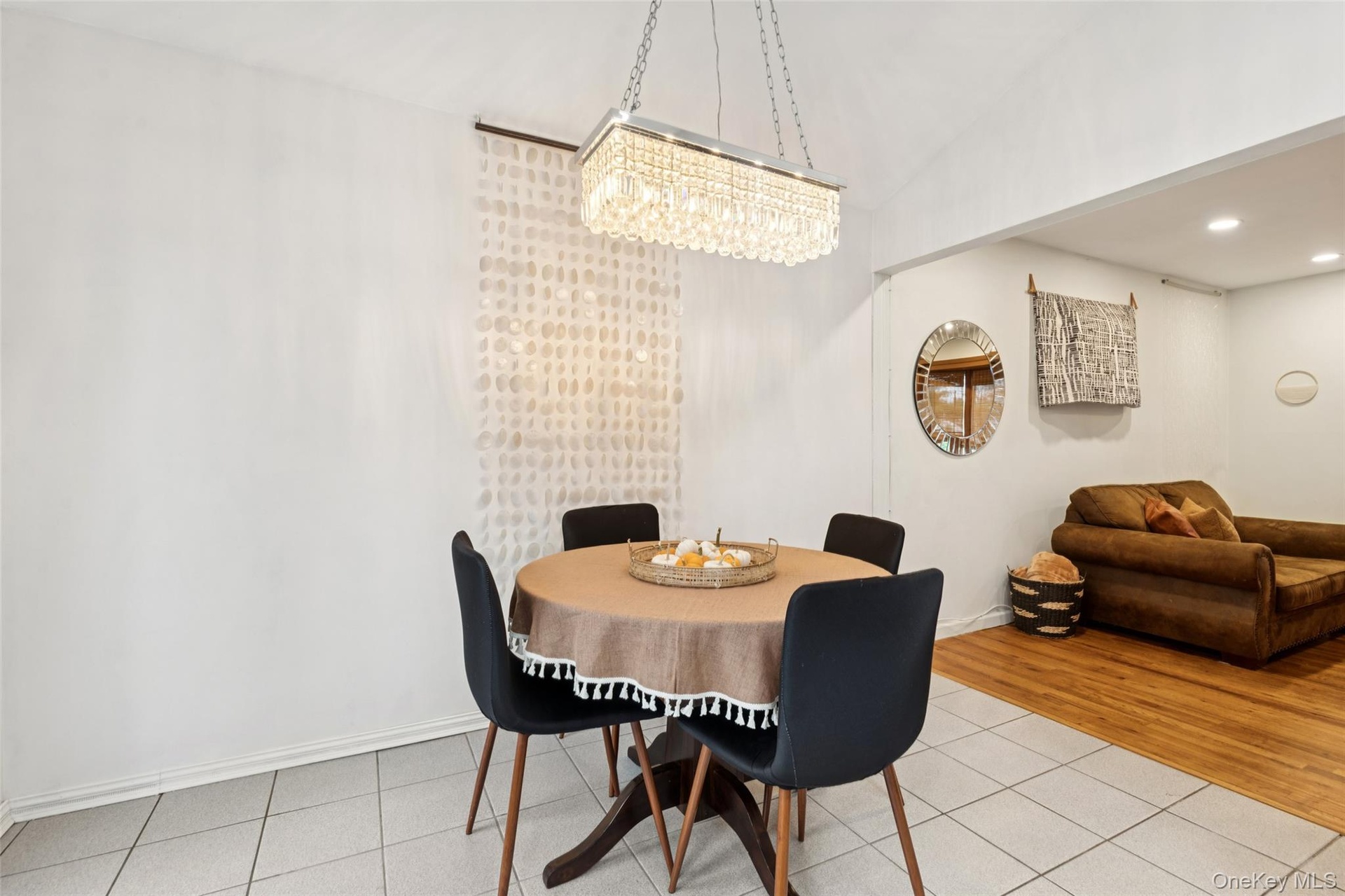 - Dining area with light tile patterned flooring, recessed lighting, and a chandelier