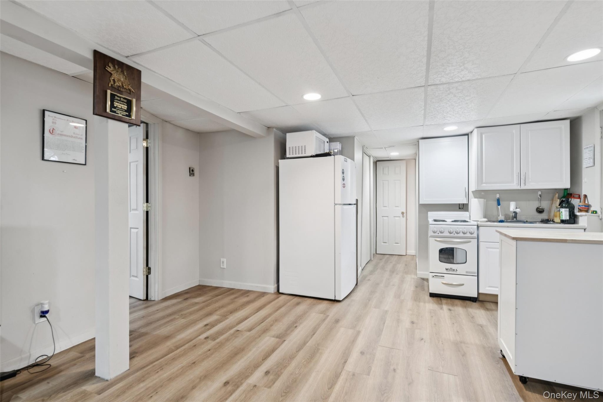 - Kitchen featuring light countertops, white cabinetry, white appliances, a paneled ceiling, and light wood finished floors