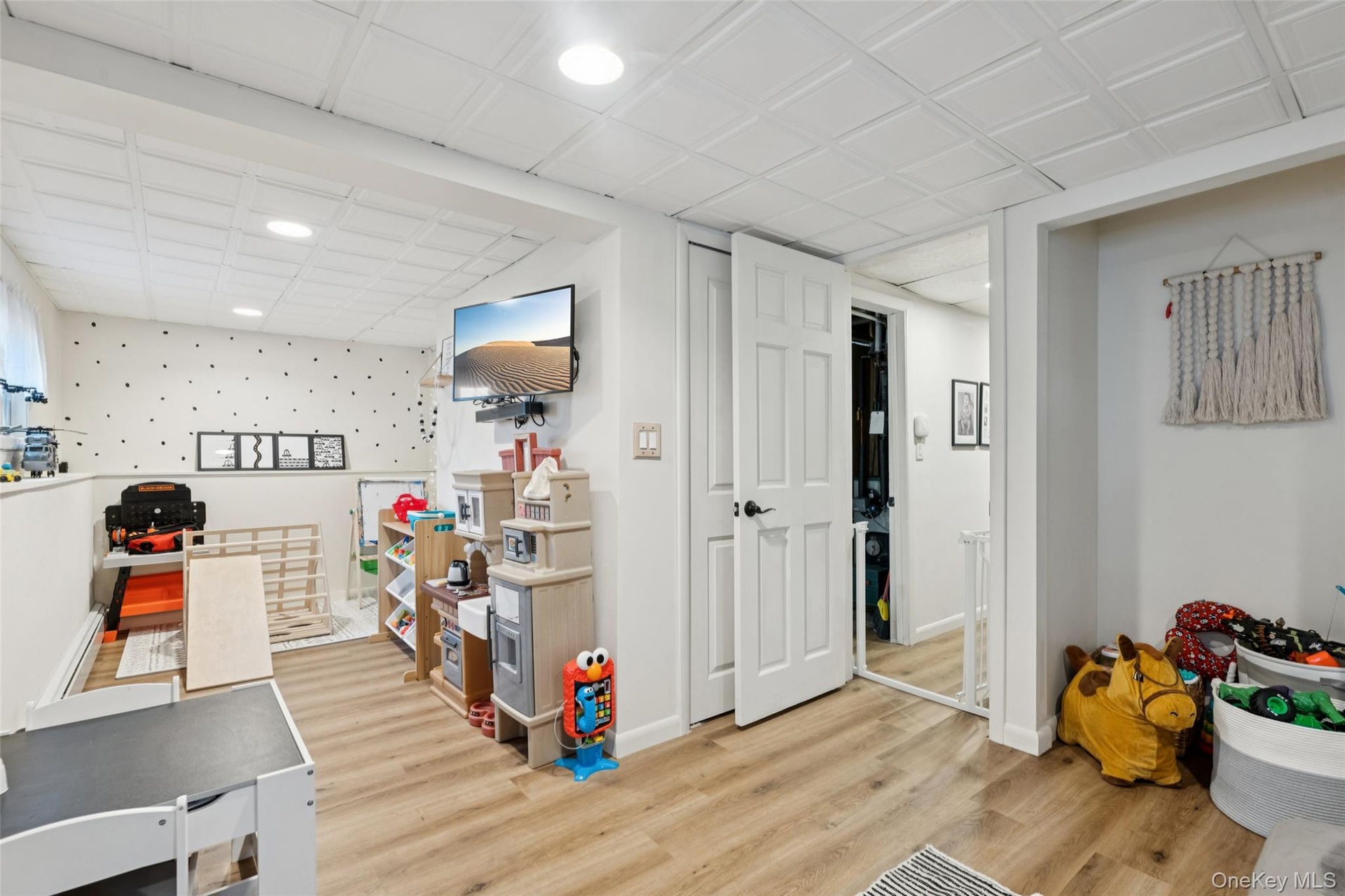 - Rec room with recessed lighting and light wood finished floors