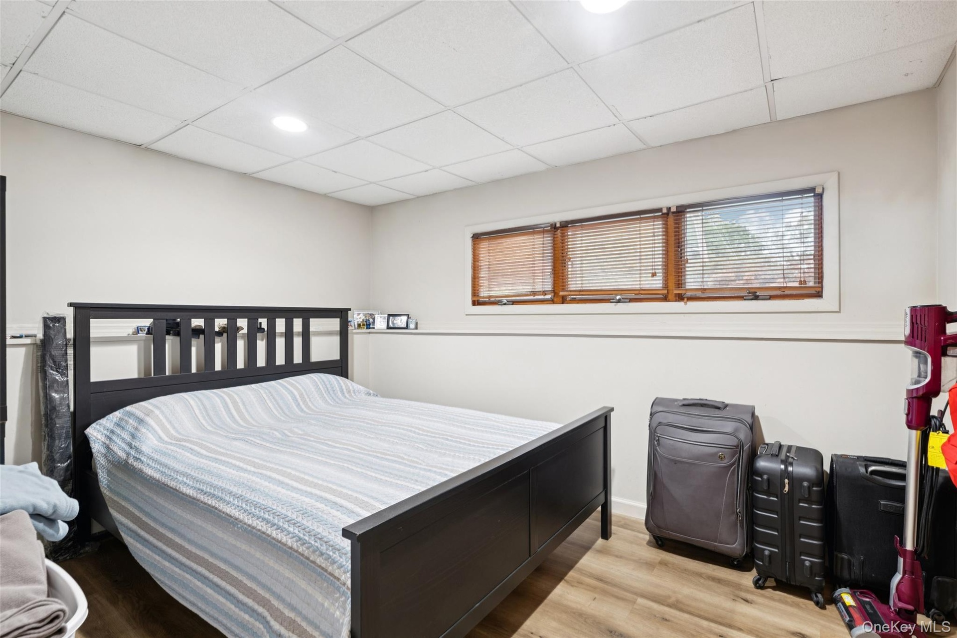- Bedroom with wood finished floors, a drop ceiling, and recessed lighting
