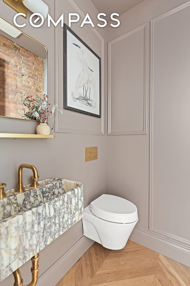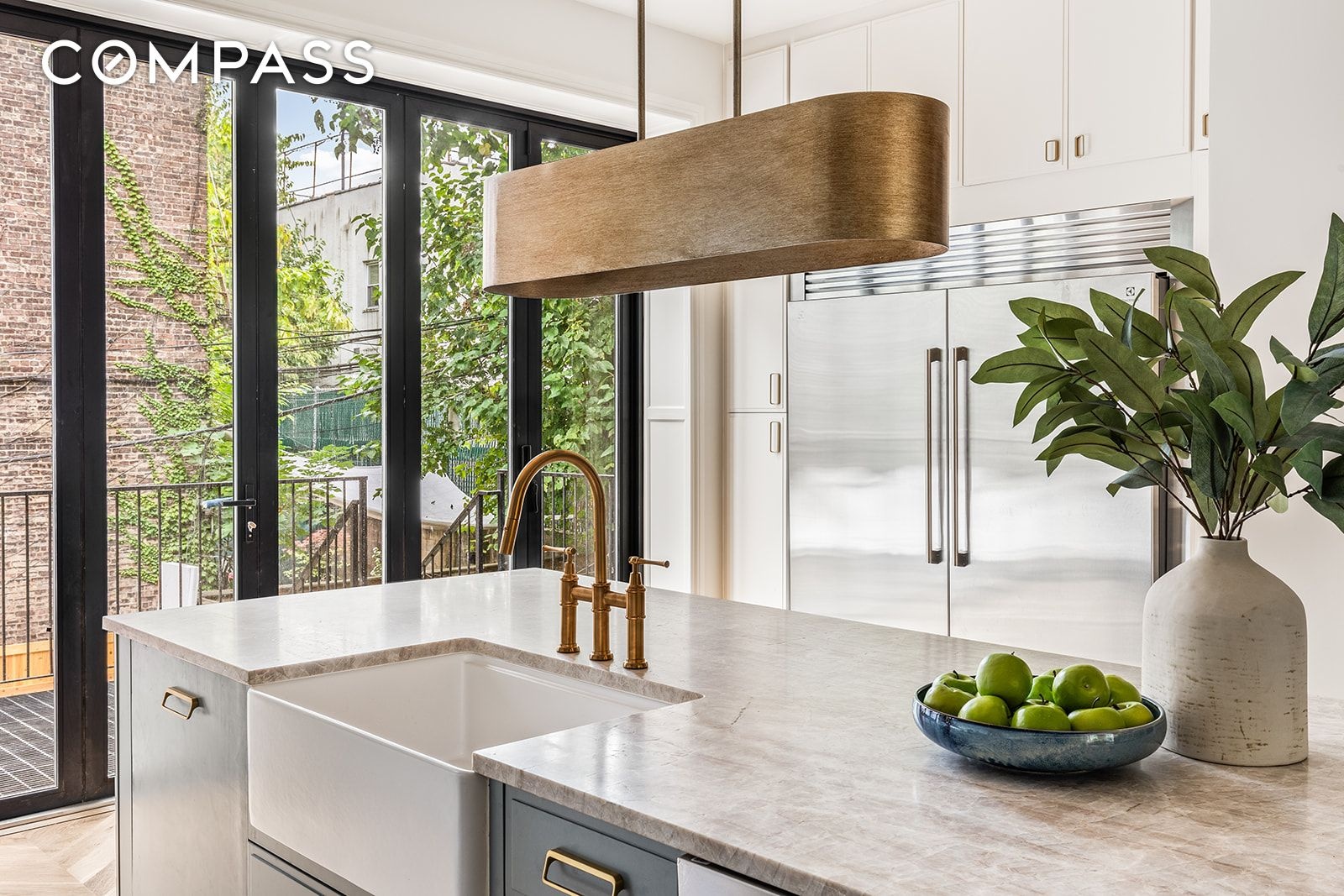 The custom chef’s kitchen is as functional as it is beautiful, designed for those who love to cook and entertain. Anchored by a massive 33-inch Electrolux refrigerator, it features top-of-the-line appliances, custom cabinetry, and refined finishes that speak to its bespoke craftsmanship. Just off the kitchen, a powder room with a marble sink and brushed gold fixtures adds a touch of luxury, while a wall of accordion glass doors opens seamlessly to a private deck overlooking a lush, landscaped backyard—the perfect backdrop for al fresco dining or quiet moments outdoors.