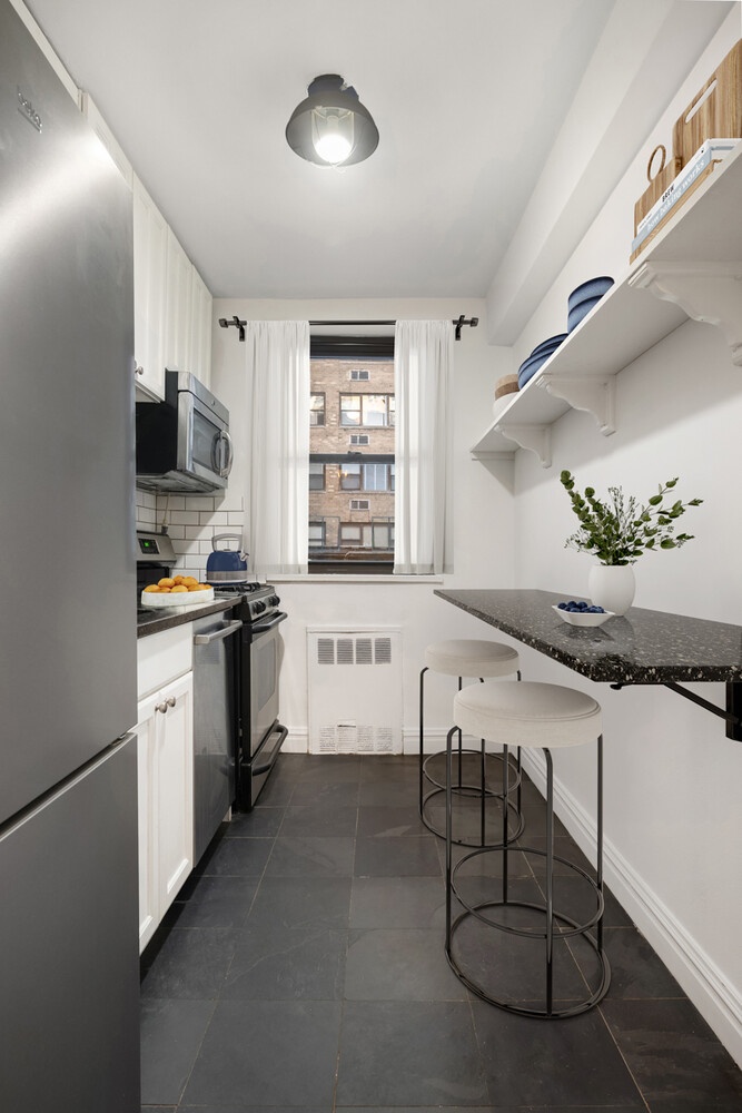 Spacious and charming, one-bedroom, one-bathroom, featuring large living room with separate dining area, renovated windowed kitchen, large primary corner bedroom and a windowed renovated bathroom. A gracious foyer, with two closets, leads to the large living room with separate dining area. The windowed kitchen features a granite counter top, stainless steel appliances and ceramic flooring. The well-proportioned primary bedroom comfortably fits a king-sized bed, has a large closet, and corner windows. The windowed bathroom includes a glass shower stall, a Carrera marble vanity and flooring and subway tile.