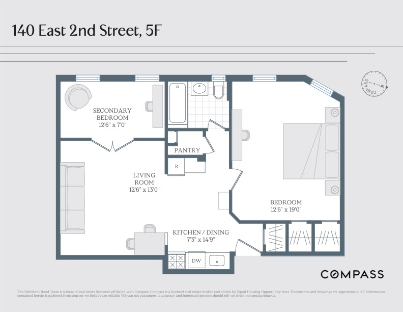 The primary bedroom sits on the other side of the apartment, and features two large and deep closets, as well as two big windows facing West. The space easily accommodates a King-sized bed, as well as desk and/or dressers. It is light filled and peaceful, a cozy retreat. Directly beside the bedroom is the bathroom, recently updated, which is windowed and has a nice tub.