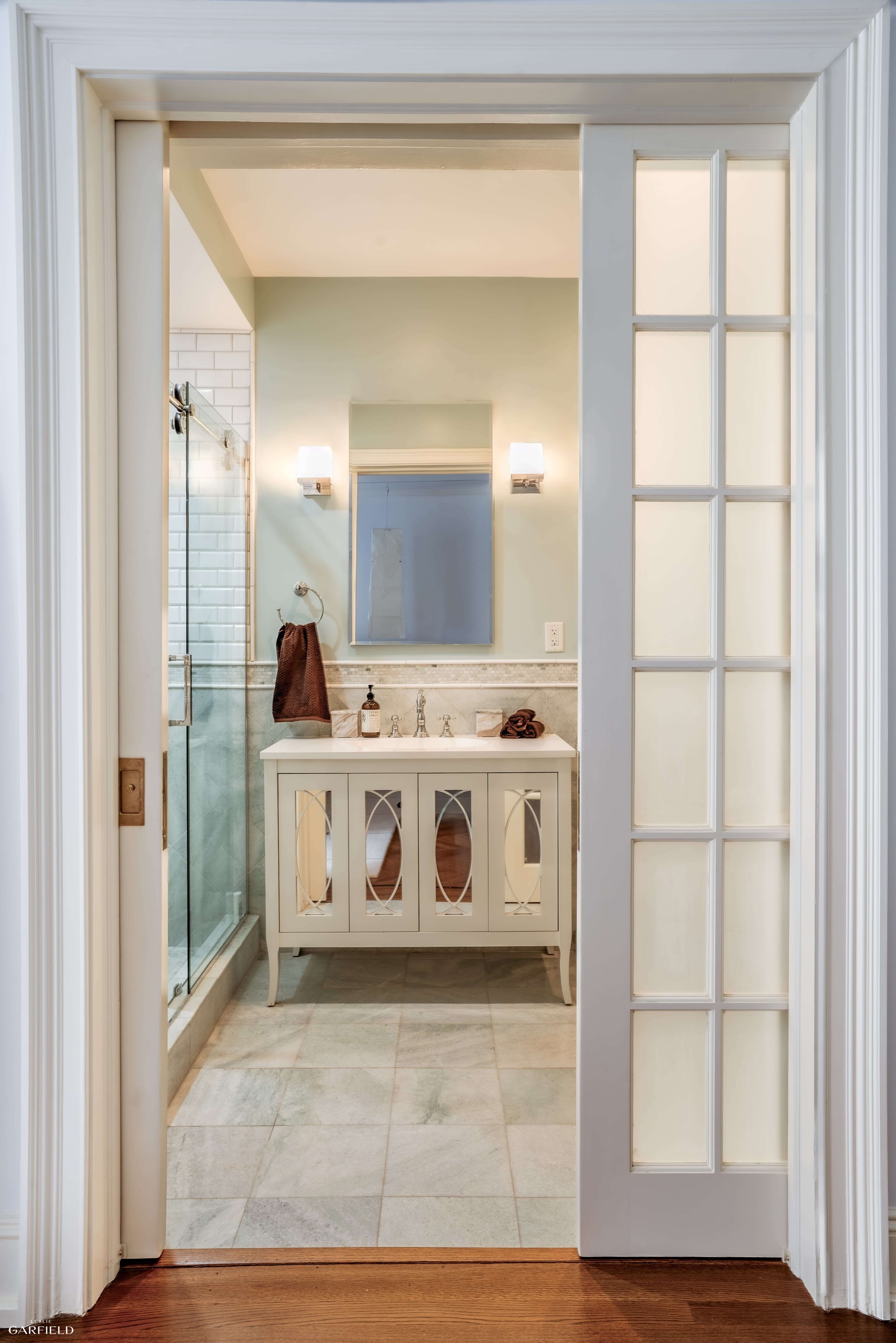 The primary suite spans an entire level and is bathed in natural light through tall front and rear windows. It includes a spacious sleeping chamber and adjoining den or office. The upper floors offer additional flexibility, with gracious bedroom suites featuring original mantels, as well as space for offices or nurseries.