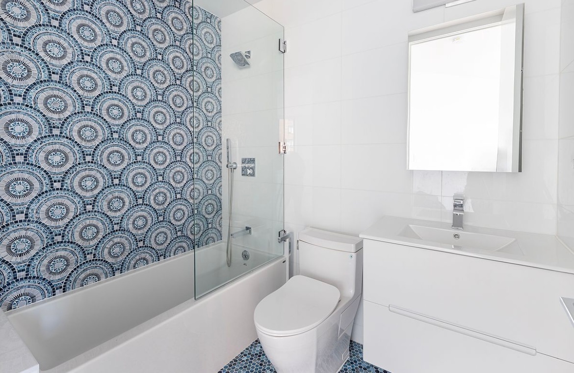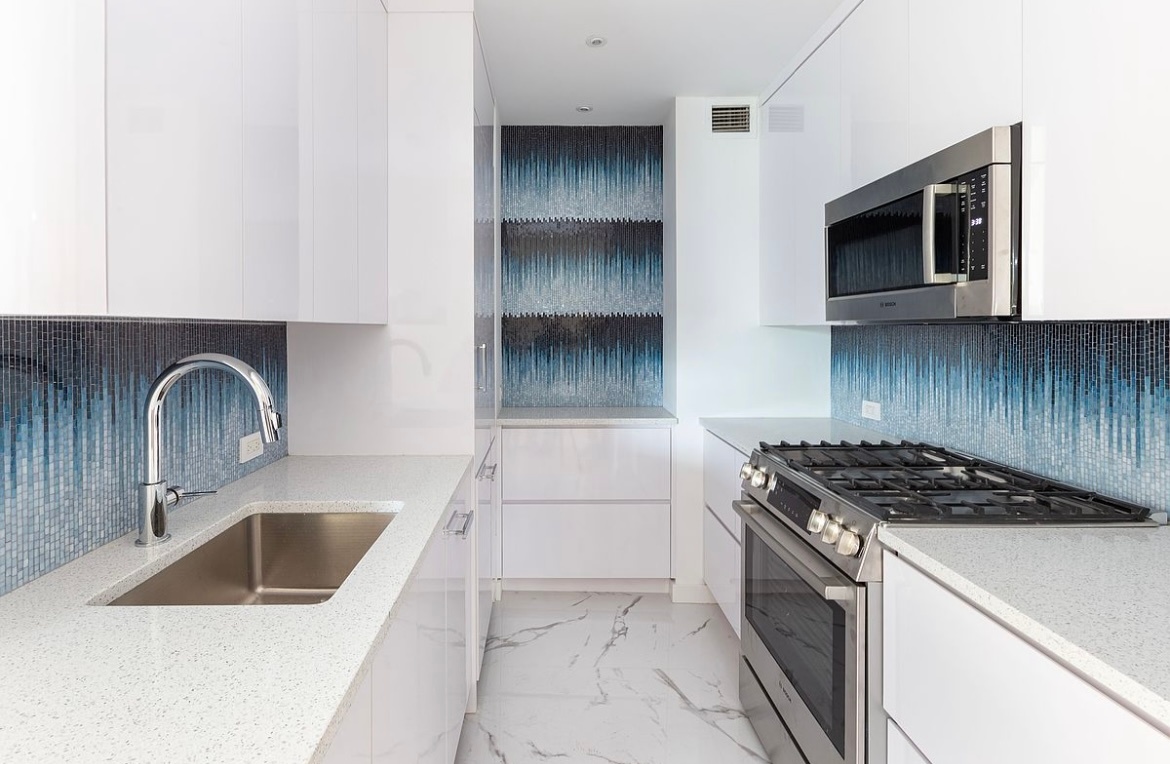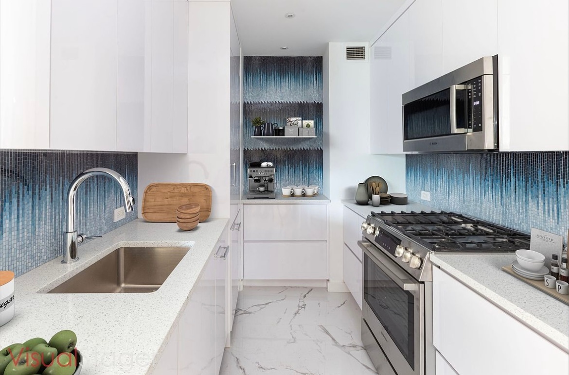The custom-designed white formica kitchen is reminiscent of an aquatic oasis, featuring sleek Bosch appliances, stone countertops, and a custom glass tiled backsplash. It is a perfect space for cooking and entertaining.