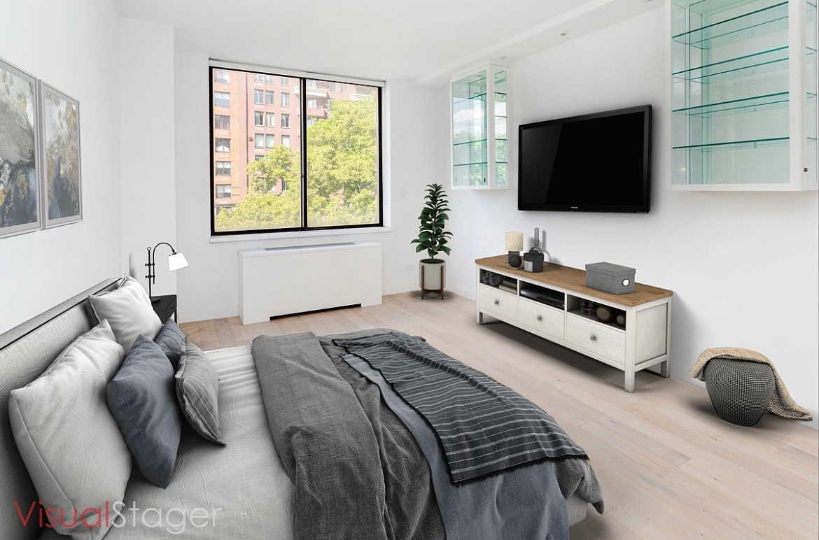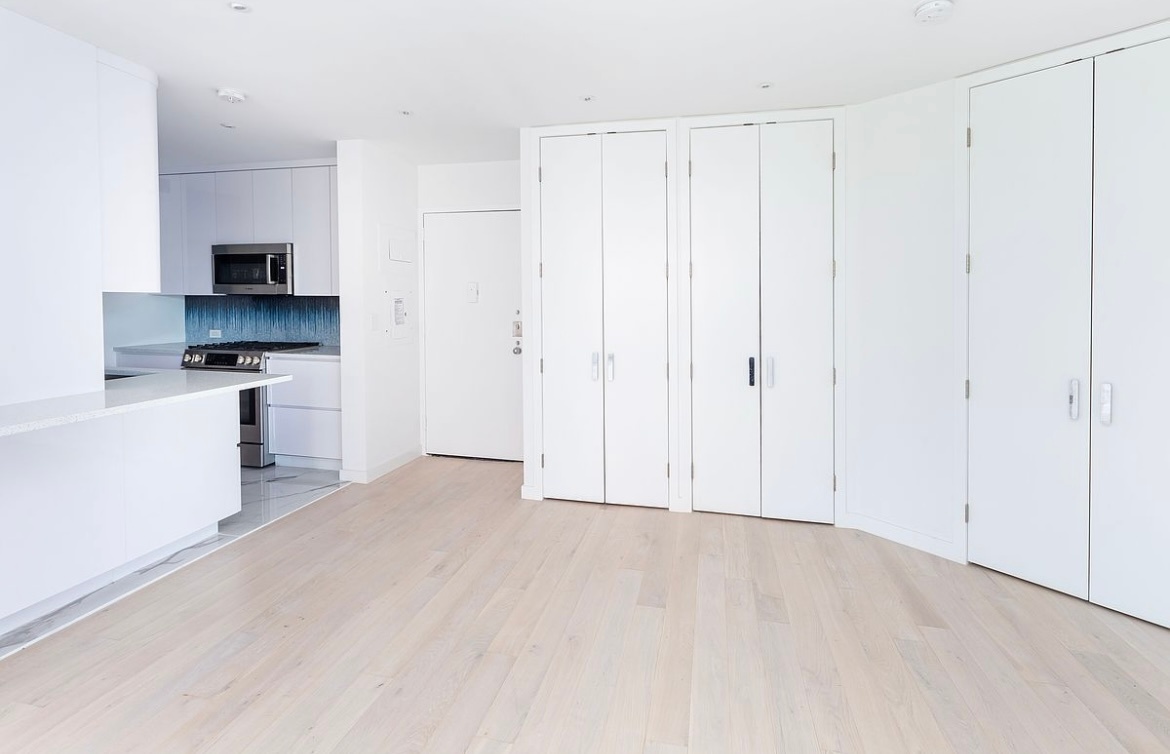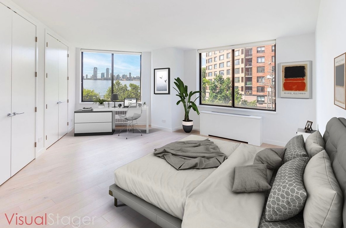 The primary bedroom offers direct views of the Hudson River and boasts an en-suite bathroom with a soaking tub and Grohe fixtures. It also includes two spacious custom closets with LED lighting. Every detail in this room has been carefully considered to offer both style and functionality.