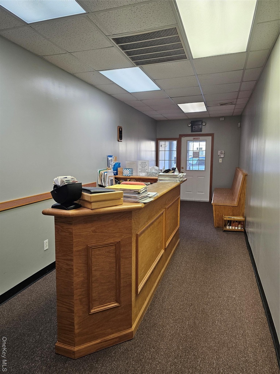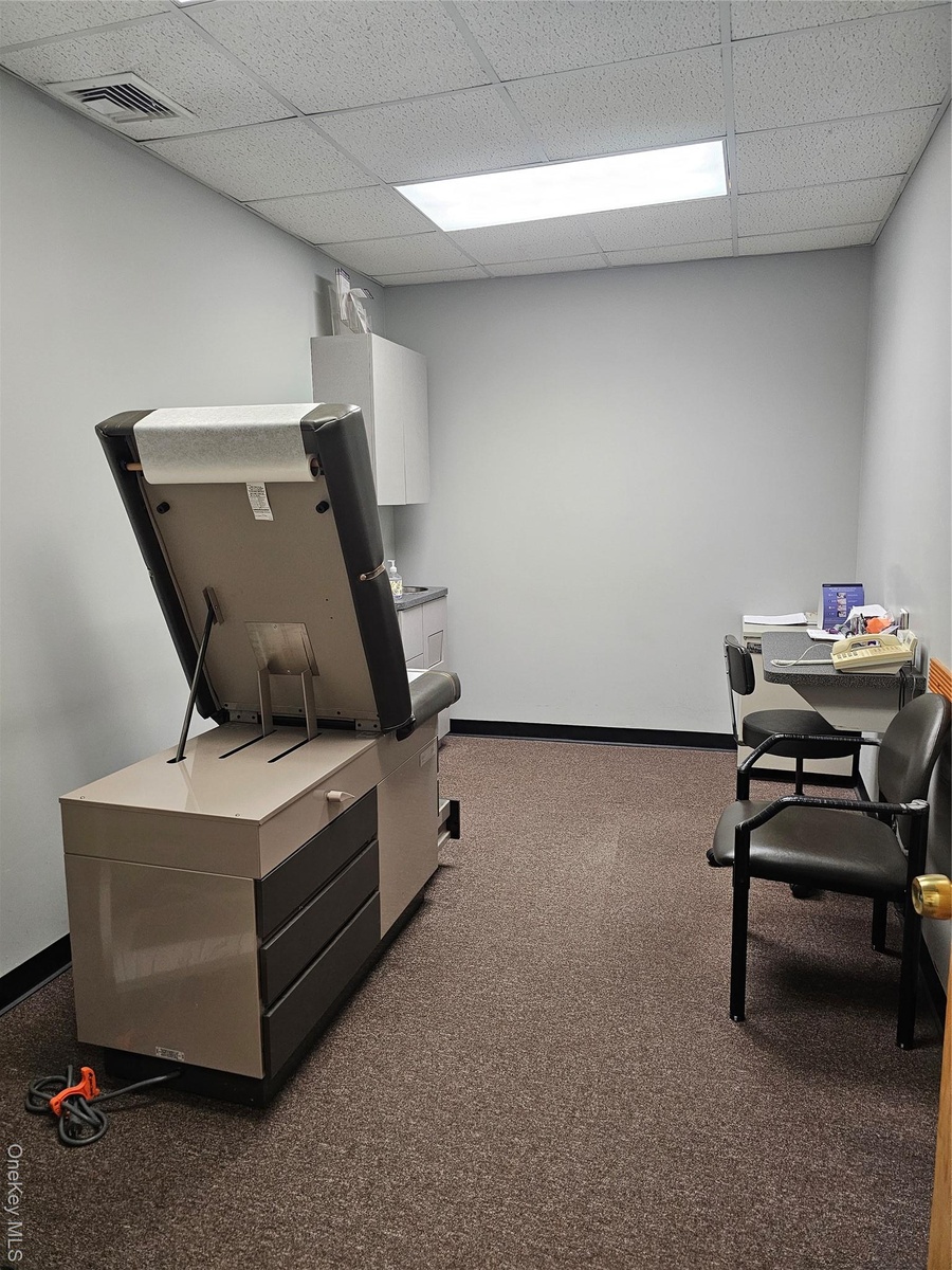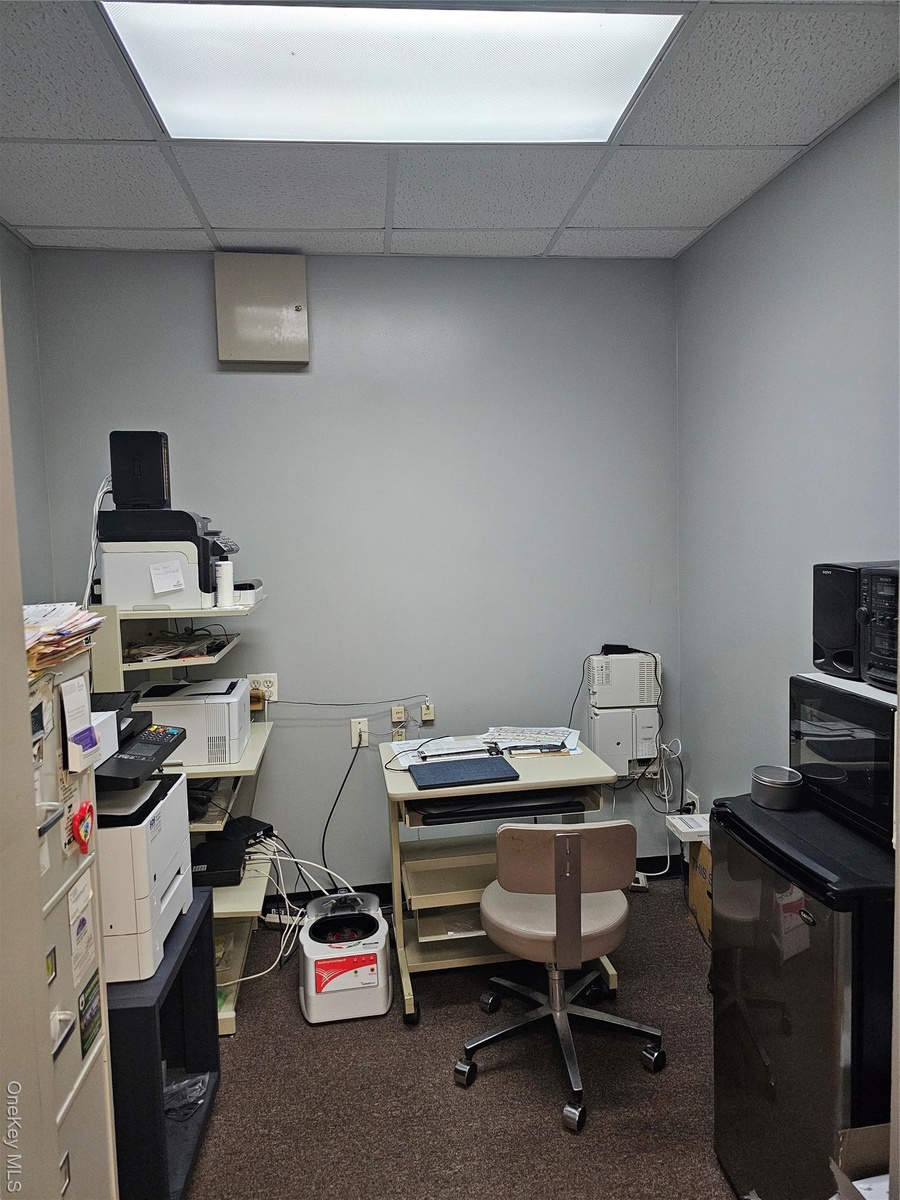 - Office space with a drop ceiling and dark carpet