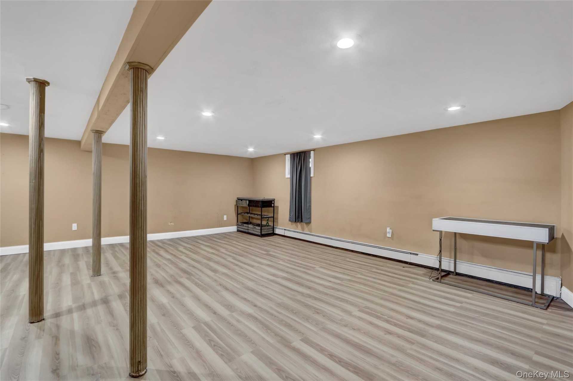 - Finished basement with a baseboard radiator, light wood finished floors, and recessed lighting