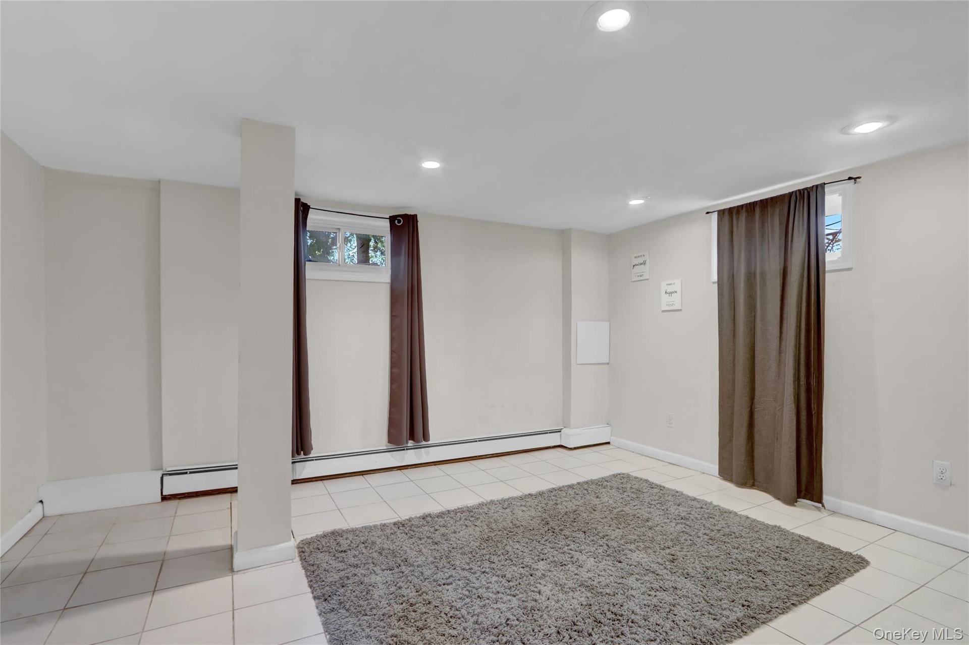- Basement featuring light tile patterned floors, recessed lighting, and a baseboard heating unit
