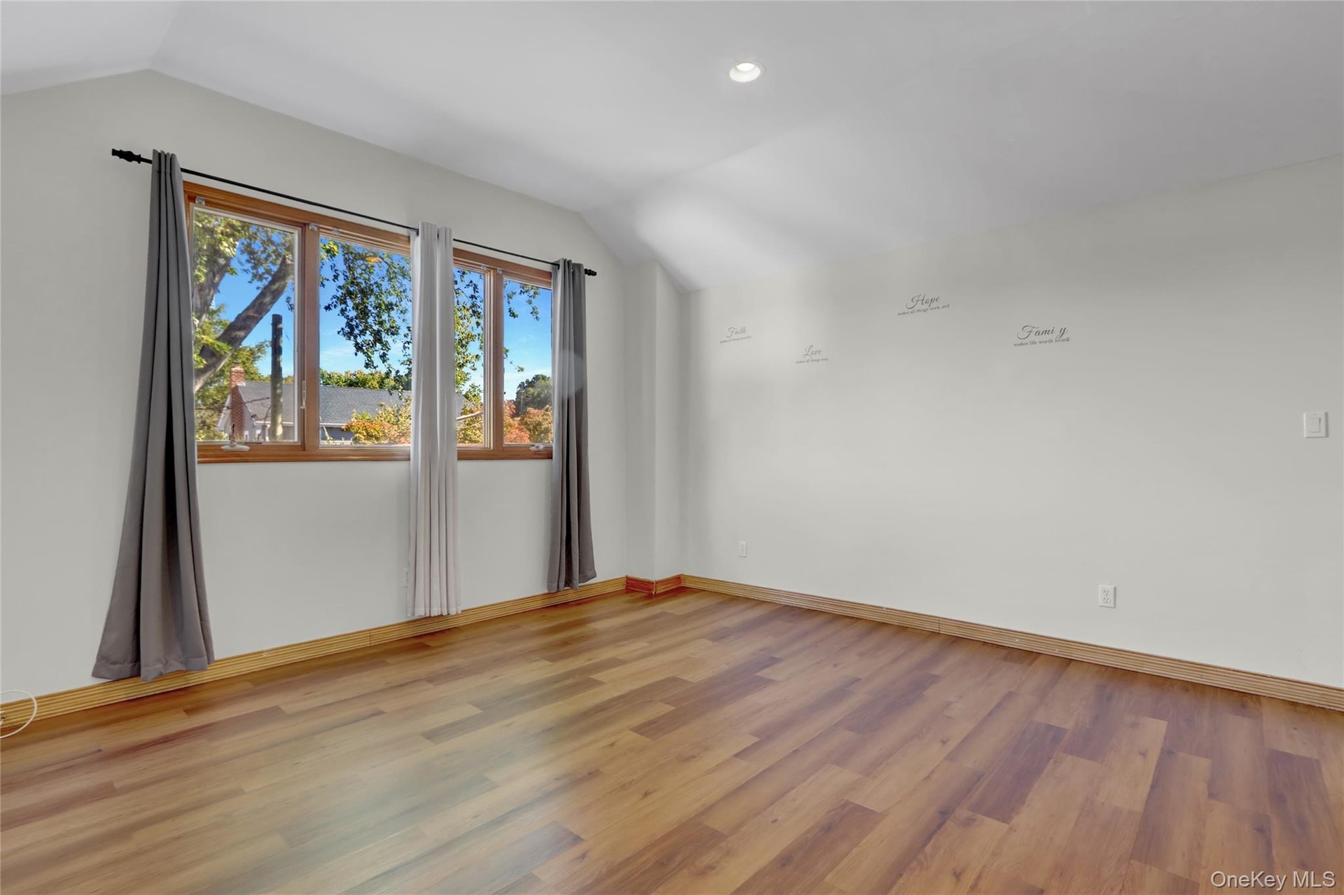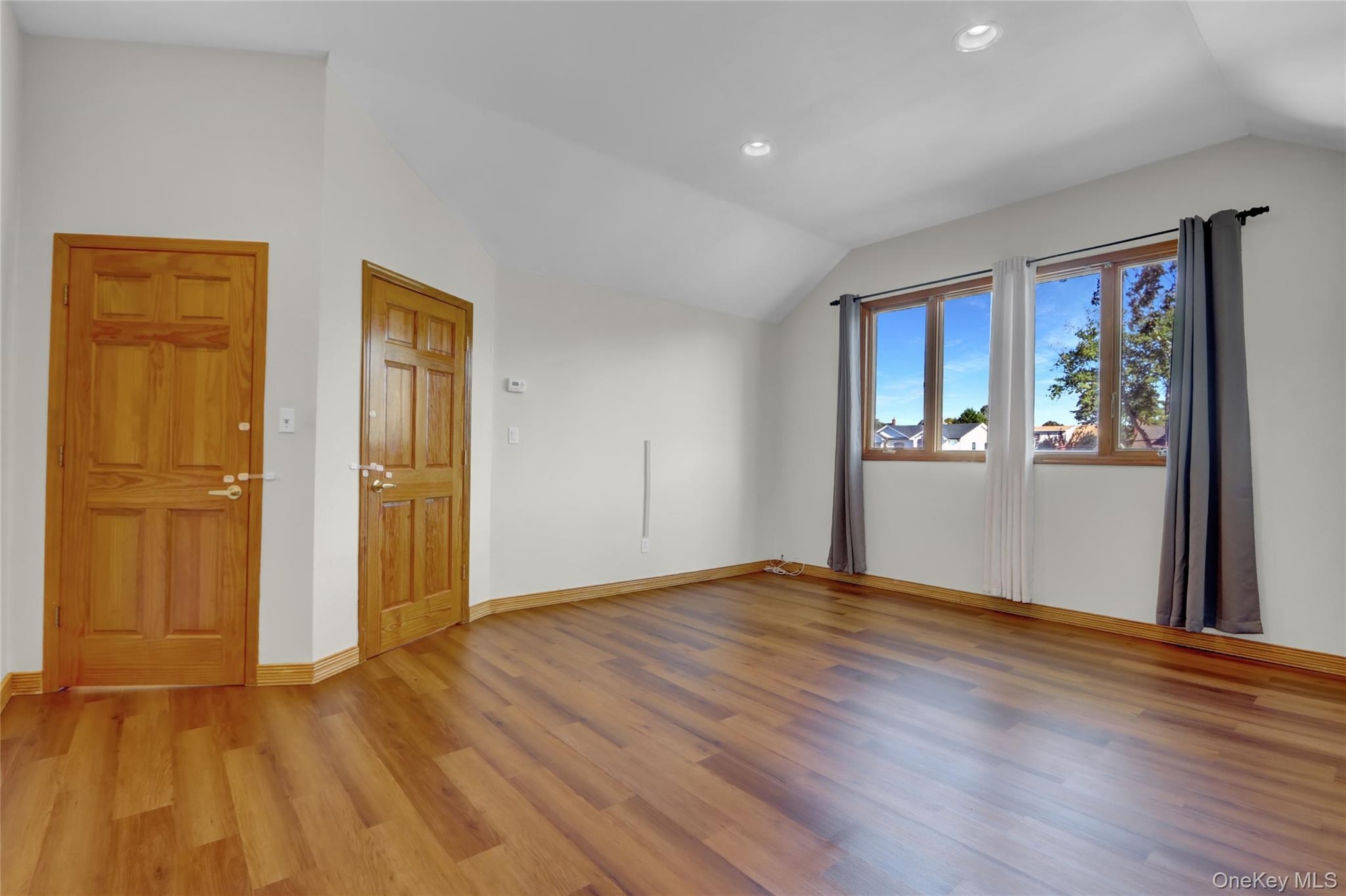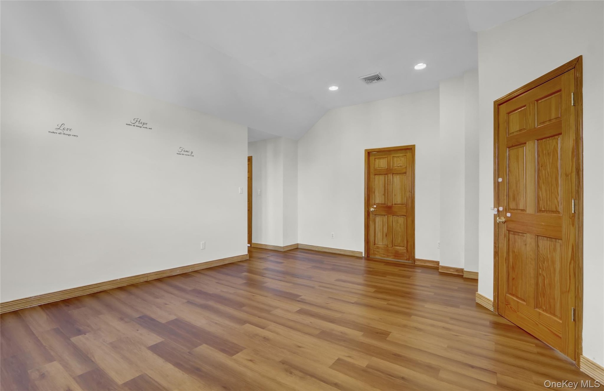 - Spare room featuring lofted ceiling, wood finished floors, and recessed lighting