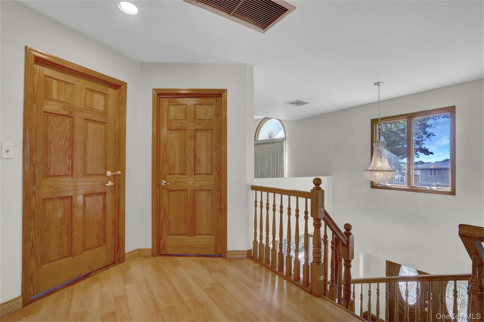 - Corridor featuring an upstairs landing, wood finished floors, recessed lighting, and a chandelier