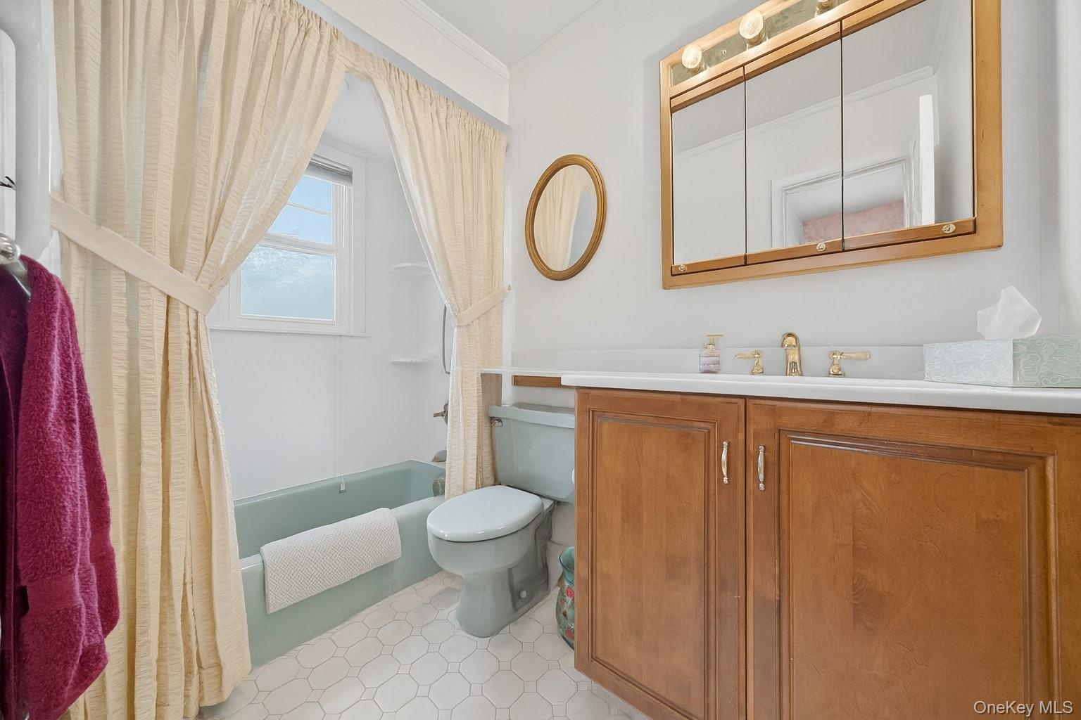 - Bathroom with shower / bathtub combination with curtain and vanity