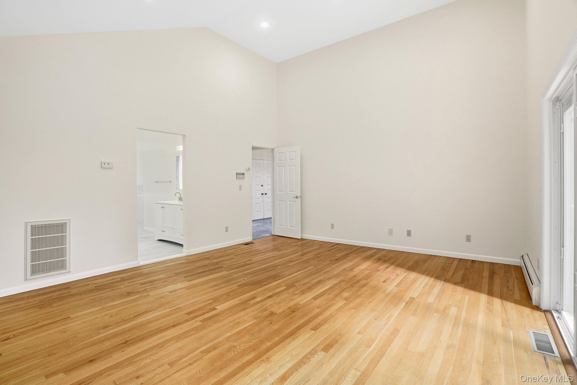 - Primary Bedroom with high vaulted ceiling, light wood flooring, recessed lighting, and en-suite bathroom, sliding glass door to primary deck**virtual
