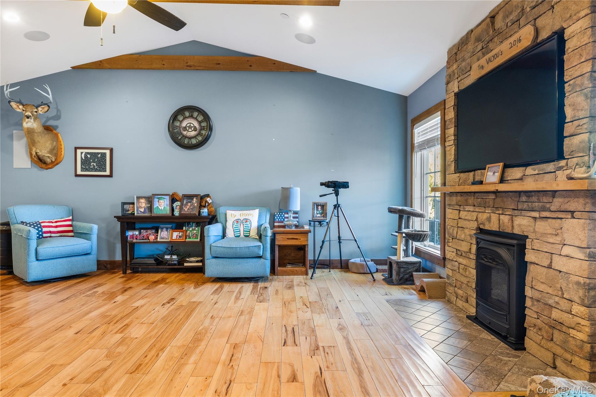- Living room featuring wood finished floors, a ceiling fan, and a stone fireplace