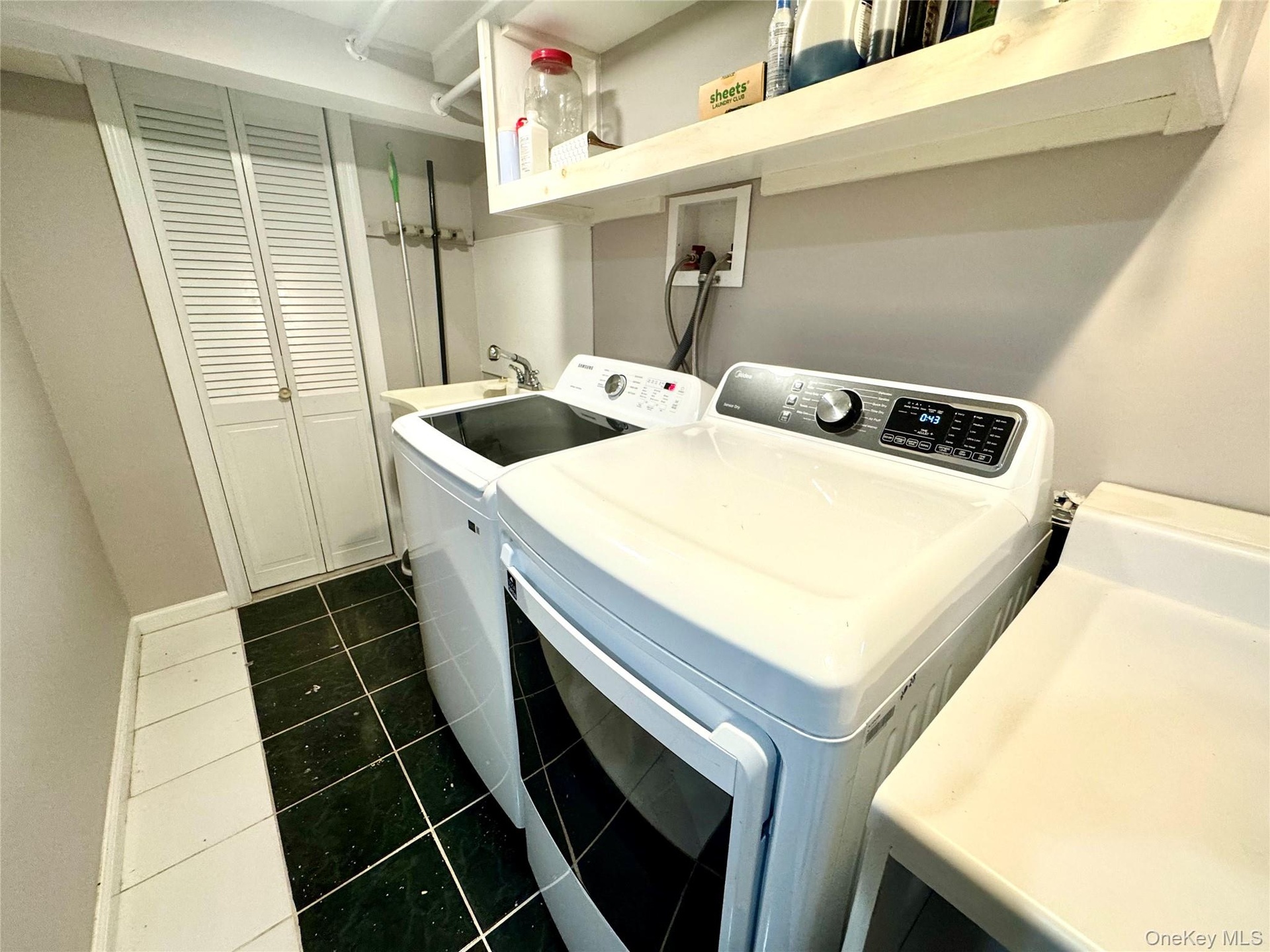 - Laundry area with dark tile patterned floors and washing machine and dryer
