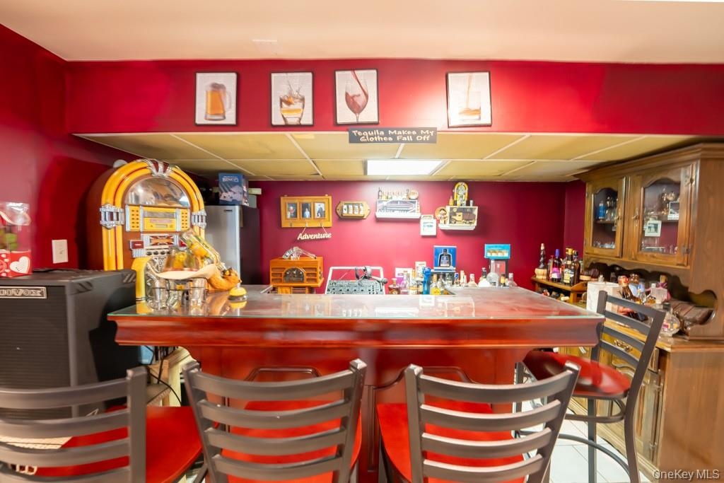 - Indoor dry bar featuring a paneled ceiling and glass insert cabinets