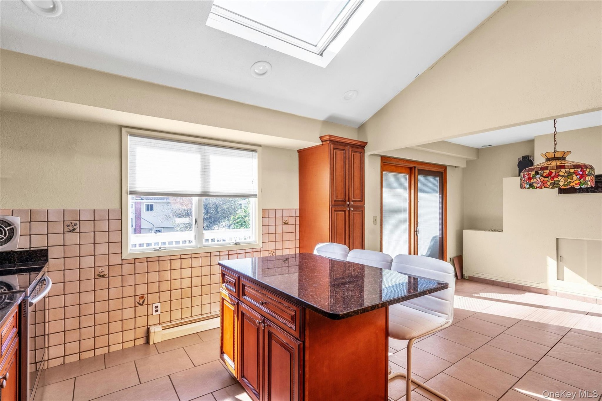 - Kitchen with a kitchen bar, light tile patterned floors, vaulted ceiling, dark stone counters, and plenty of natural light