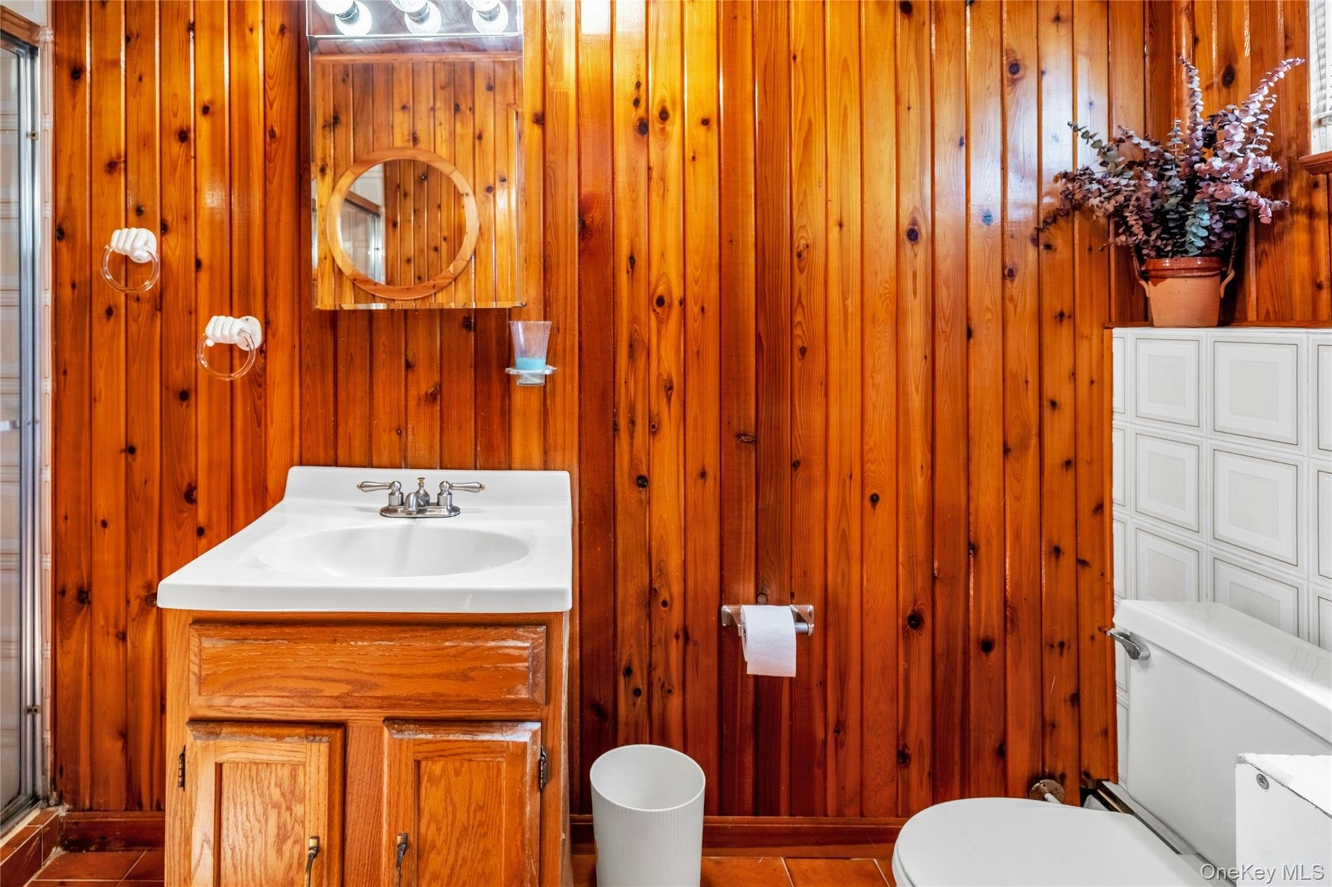 - Bathroom featuring vanity, wood walls, a stall shower, and tile patterned floors