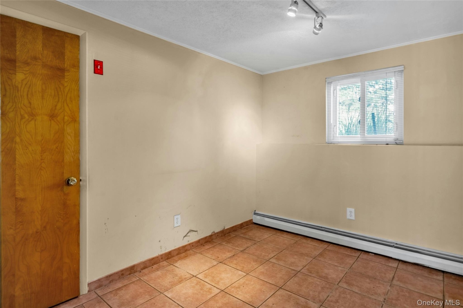 - Tiled spare room featuring a baseboard heating unit, crown molding, rail lighting, and a textured ceiling