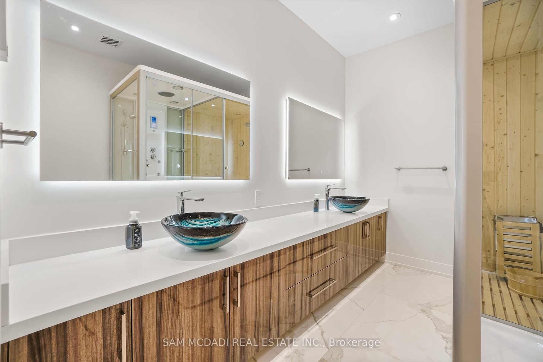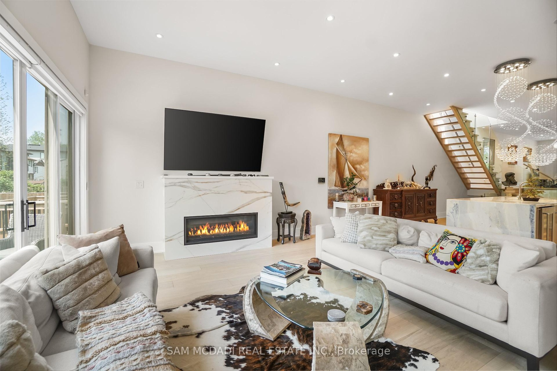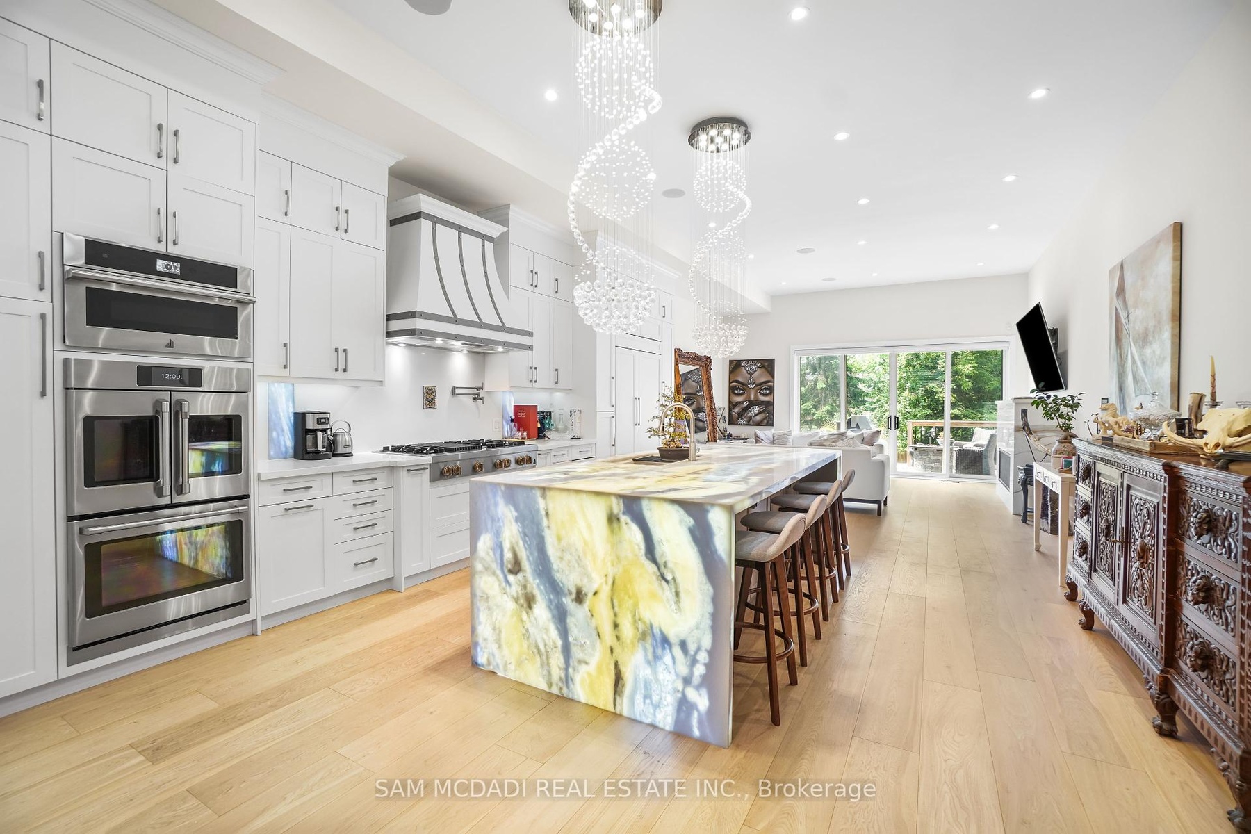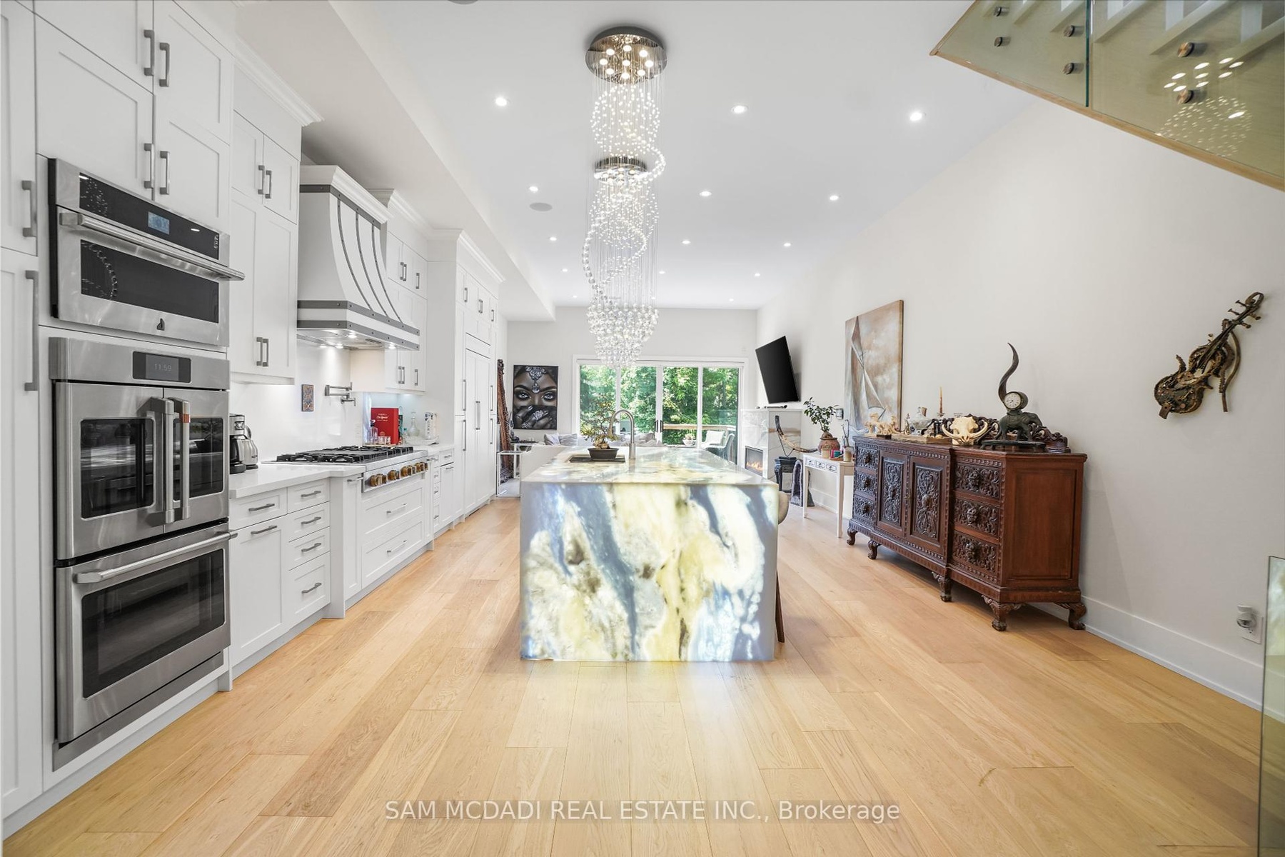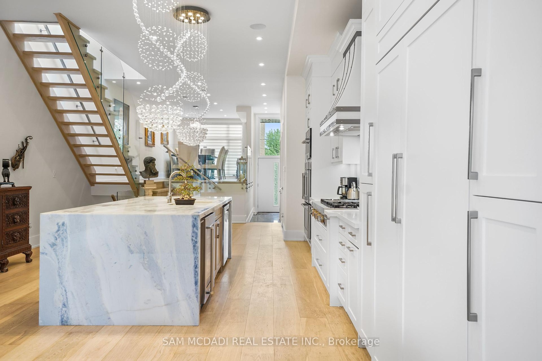 Set in one of Mississauga's most sought-after and evolving neighbourhoods, 1036 Enola Avenue isn't just a home, it's a daily escape into luxury and modern living. Just minutes from the upcoming Lakeview Village, Port Credit, and Lake Ontario's shoreline, this stunning residence blends sophistication with everyday functionality, offering over 3,600 sq ft of meticulously finished space. With no detail overlooked, this custom showpiece features 11-ft ceilings on the main level, open-tread staircases, and sleek glass railings that create effortless flow and sophistication. At the heart of the home, the chef's kitchen is outfitted with built-in premium appliances, custom hood, and a showstopping illuminated imported marble island. Pot lights, wide-plank flooring, and integrated speakers enhance the modern aesthetic. The adjoining living area is anchored by a sleek gas fireplace and full-length windows framing tranquil, green views. The spa-inspired primary suite offers a sculptural soaking tub, dual rainfall shower towers, and a custom walk-in closet. Additional bedrooms are generously sized with designer finishes, and a skylight above the upper hallway floods the space with natural light. The fully finished lower level elevates the living experience with a glass-enclosed wine cellar, private sauna, and a separate walk-up entrance, ideal for extended family, a home office, or rental income. A modern bathroom with double vessel sinks completes the space. Each level features built-in iPad screens connected to the door camera system for secure, voice-enabled entry, while integrated speakers throughout the home are powered by a premium Onkyo audio system perfect for immersive, whole-home sound. Outside, a fenced yard and deck create a private setting for summer entertaining. Just steps from lakefront parks, golf, top-tier schools, and with easy access to the QEW, Highway 403, and the GO Station, this is luxury living in Lakeview at its finest.
