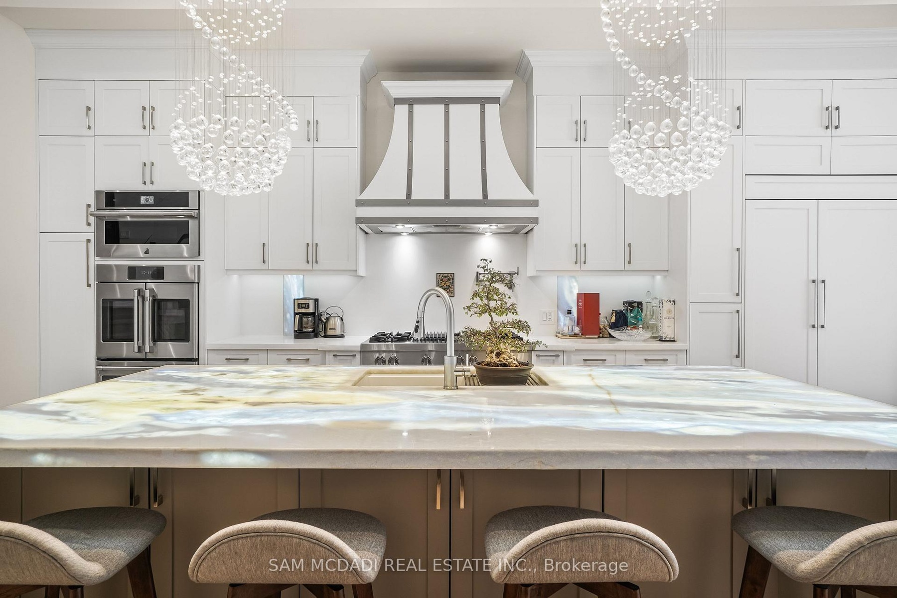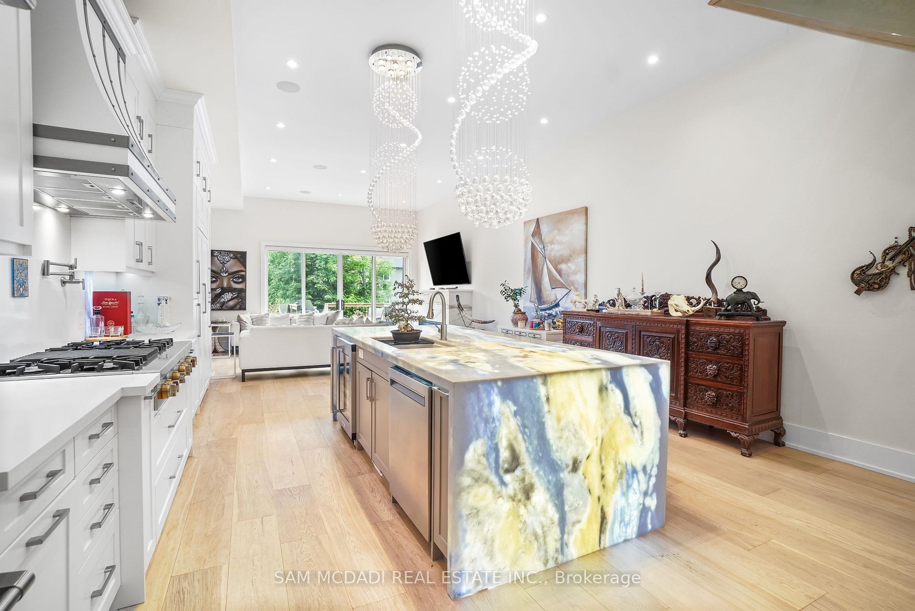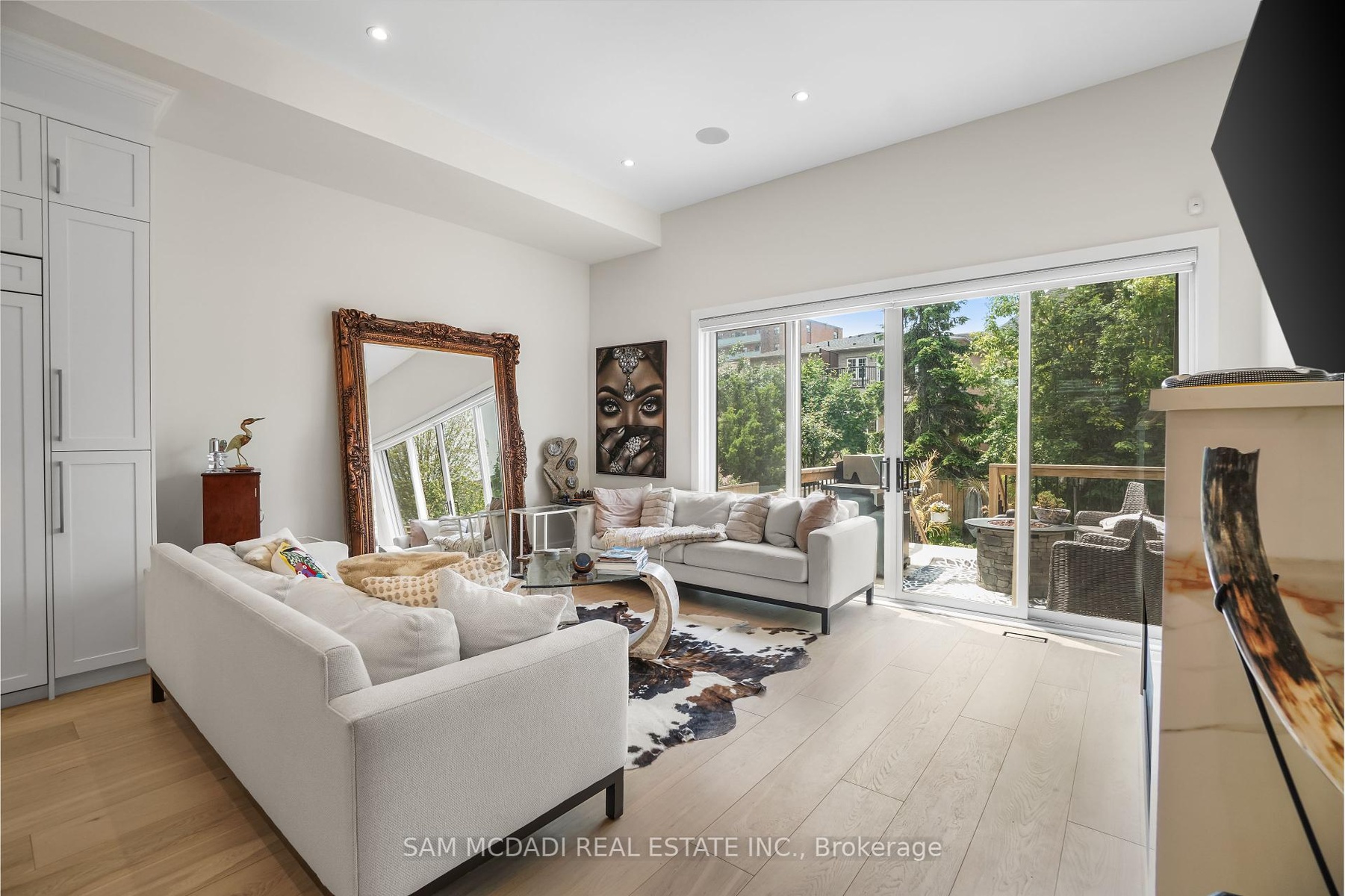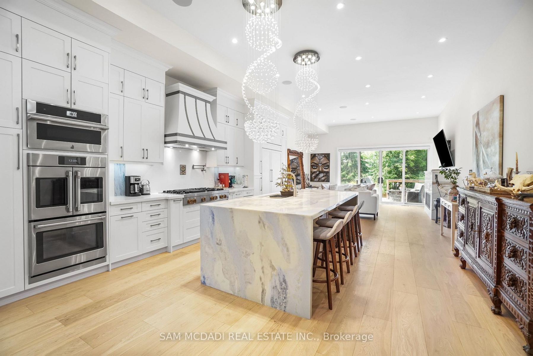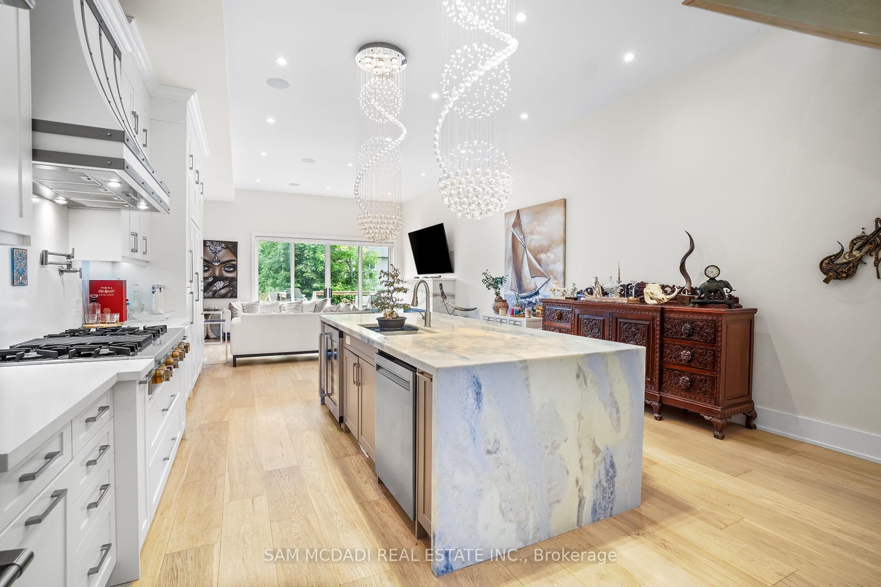 Set in one of Mississauga's most sought-after and evolving neighbourhoods, 1036 Enola Avenue isn't just a home, it's a daily escape into luxury and modern living. Just minutes from the upcoming Lakeview Village, Port Credit, and Lake Ontario's shoreline, this stunning residence blends sophistication with everyday functionality, offering over 3,600 sq ft of meticulously finished space. With no detail overlooked, this custom showpiece features 11-ft ceilings on the main level, open-tread staircases, and sleek glass railings that create effortless flow and sophistication. At the heart of the home, the chef's kitchen is outfitted with built-in premium appliances, custom hood, and a showstopping illuminated imported marble island. Pot lights, wide-plank flooring, and integrated speakers enhance the modern aesthetic. The adjoining living area is anchored by a sleek gas fireplace and full-length windows framing tranquil, green views. The spa-inspired primary suite offers a sculptural soaking tub, dual rainfall shower towers, and a custom walk-in closet. Additional bedrooms are generously sized with designer finishes, and a skylight above the upper hallway floods the space with natural light. The fully finished lower level elevates the living experience with a glass-enclosed wine cellar, private sauna, and a separate walk-up entrance, ideal for extended family, a home office, or rental income. A modern bathroom with double vessel sinks completes the space. Each level features built-in iPad screens connected to the door camera system for secure, voice-enabled entry, while integrated speakers throughout the home are powered by a premium Onkyo audio system perfect for immersive, whole-home sound. Outside, a fenced yard and deck create a private setting for summer entertaining. Just steps from lakefront parks, golf, top-tier schools, and with easy access to the QEW, Highway 403, and the GO Station, this is luxury living in Lakeview at its finest.