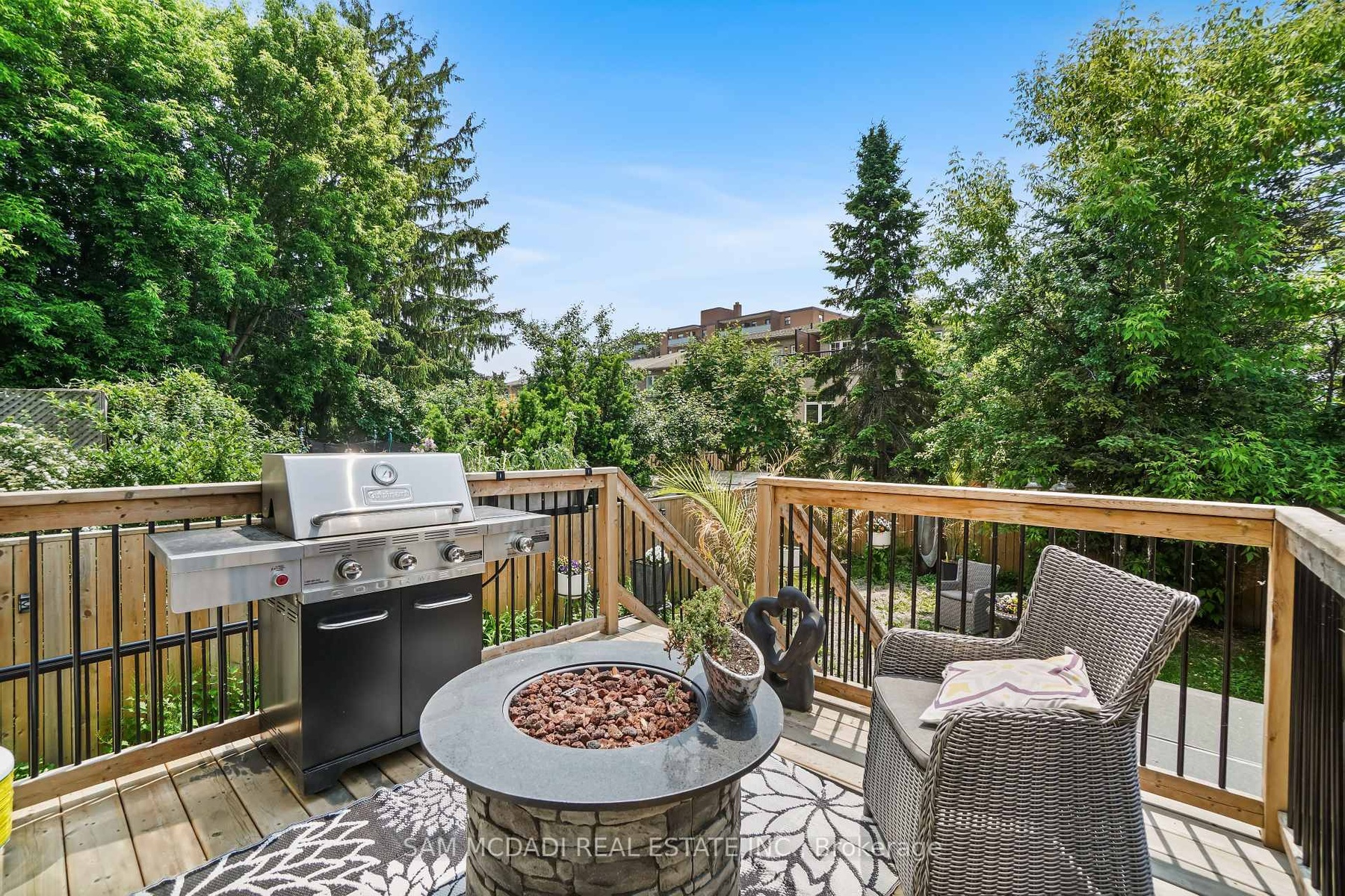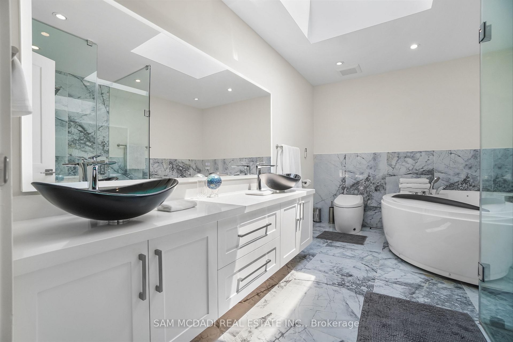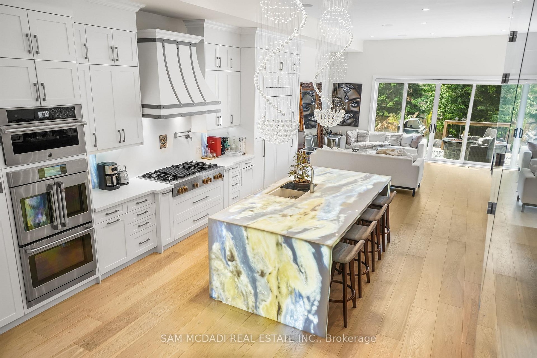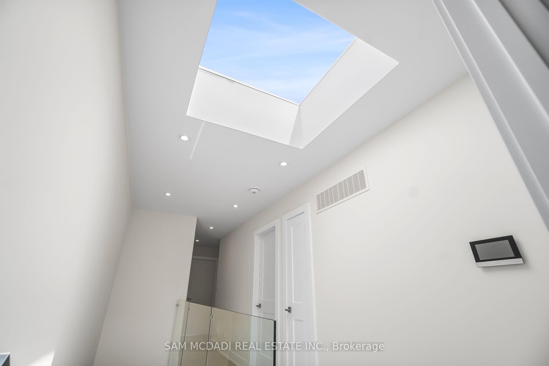 Set in one of Mississauga's most sought-after and evolving neighbourhoods, 1036 Enola Avenue isn't just a home, it's a daily escape into luxury and modern living. Just minutes from the upcoming Lakeview Village, Port Credit, and Lake Ontario's shoreline, this stunning residence blends sophistication with everyday functionality, offering over 3,600 sq ft of meticulously finished space. With no detail overlooked, this custom showpiece features 11-ft ceilings on the main level, open-tread staircases, and sleek glass railings that create effortless flow and sophistication. At the heart of the home, the chef's kitchen is outfitted with built-in premium appliances, custom hood, and a showstopping illuminated imported marble island. Pot lights, wide-plank flooring, and integrated speakers enhance the modern aesthetic. The adjoining living area is anchored by a sleek gas fireplace and full-length windows framing tranquil, green views. The spa-inspired primary suite offers a sculptural soaking tub, dual rainfall shower towers, and a custom walk-in closet. Additional bedrooms are generously sized with designer finishes, and a skylight above the upper hallway floods the space with natural light. The fully finished lower level elevates the living experience with a glass-enclosed wine cellar, private sauna, and a separate walk-up entrance, ideal for extended family, a home office, or rental income. A modern bathroom with double vessel sinks completes the space. Each level features built-in iPad screens connected to the door camera system for secure, voice-enabled entry, while integrated speakers throughout the home are powered by a premium Onkyo audio system perfect for immersive, whole-home sound. Outside, a fenced yard and deck create a private setting for summer entertaining. Just steps from lakefront parks, golf, top-tier schools, and with easy access to the QEW, Highway 403, and the GO Station, this is luxury living in Lakeview at its finest.