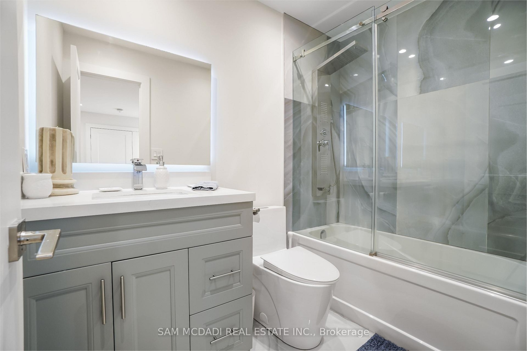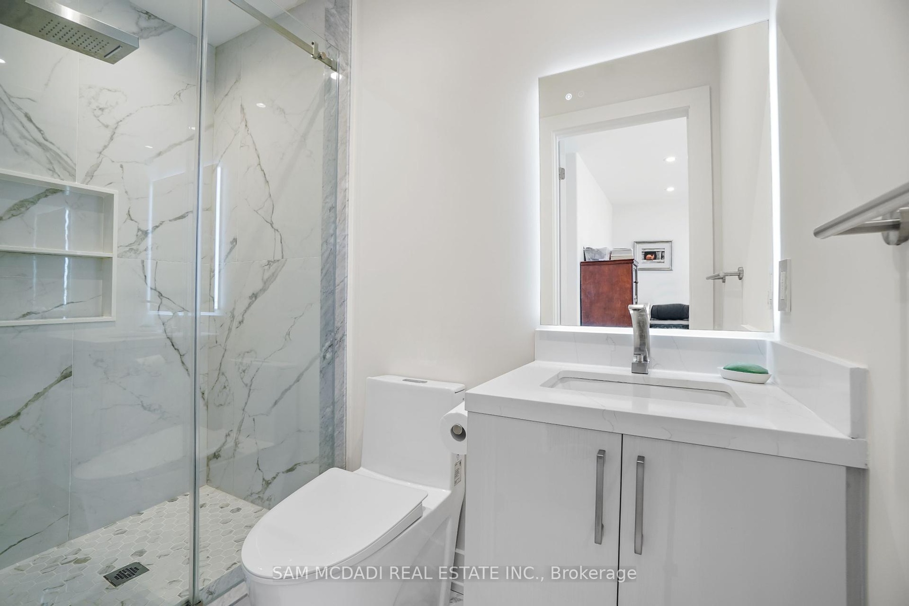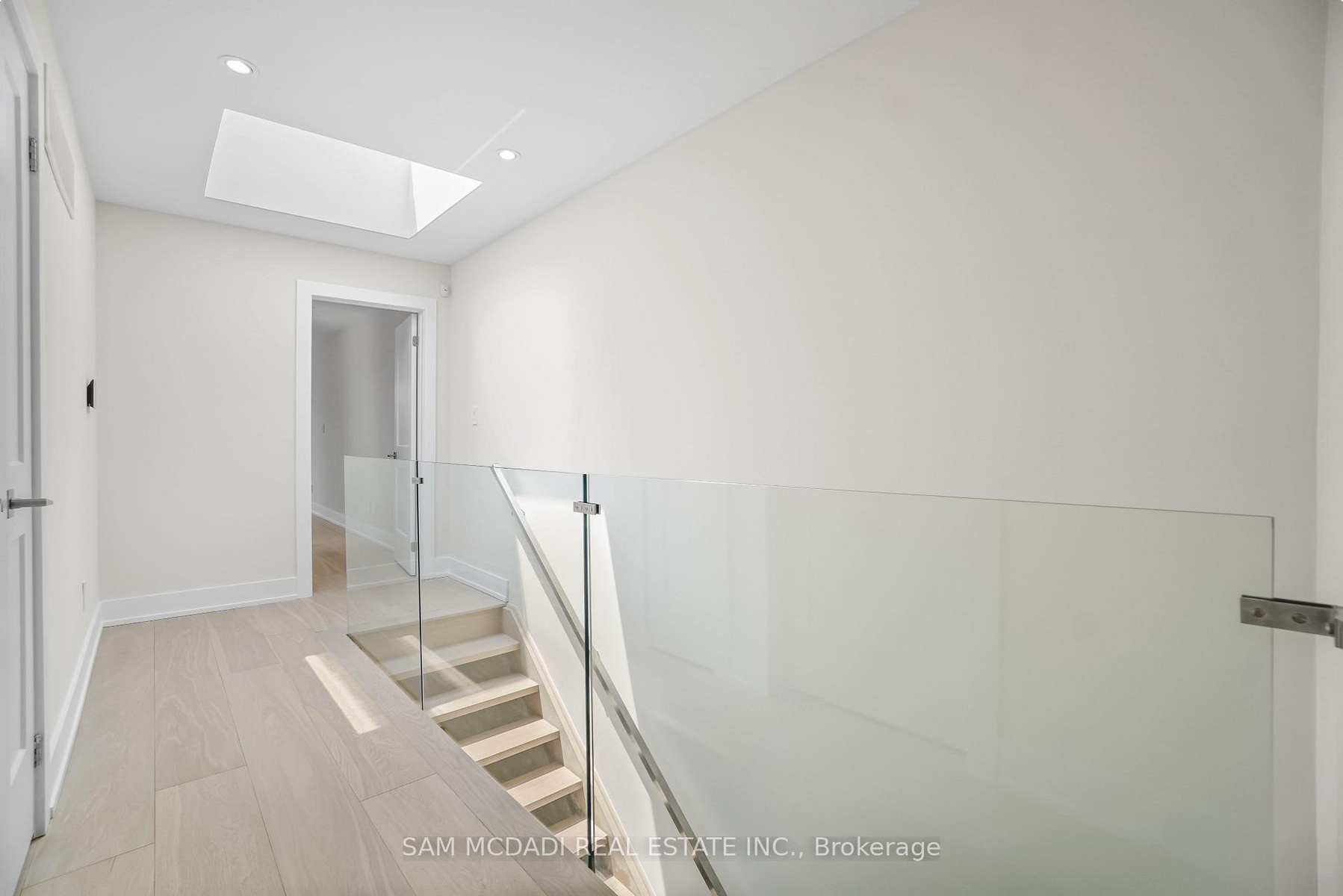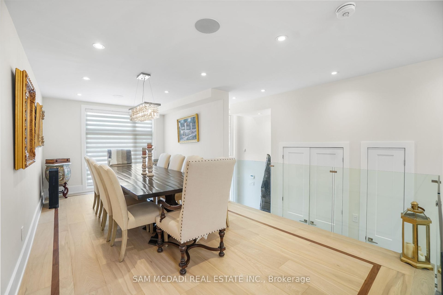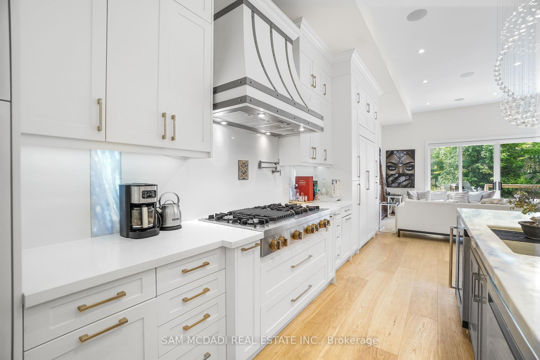 Set in one of Mississauga's most sought-after and evolving neighbourhoods, 1036 Enola Avenue isn't just a home, it's a daily escape into luxury and modern living. Just minutes from the upcoming Lakeview Village, Port Credit, and Lake Ontario's shoreline, this stunning residence blends sophistication with everyday functionality, offering over 3,600 sq ft of meticulously finished space. With no detail overlooked, this custom showpiece features 11-ft ceilings on the main level, open-tread staircases, and sleek glass railings that create effortless flow and sophistication. At the heart of the home, the chef's kitchen is outfitted with built-in premium appliances, custom hood, and a showstopping illuminated imported marble island. Pot lights, wide-plank flooring, and integrated speakers enhance the modern aesthetic. The adjoining living area is anchored by a sleek gas fireplace and full-length windows framing tranquil, green views. The spa-inspired primary suite offers a sculptural soaking tub, dual rainfall shower towers, and a custom walk-in closet. Additional bedrooms are generously sized with designer finishes, and a skylight above the upper hallway floods the space with natural light. The fully finished lower level elevates the living experience with a glass-enclosed wine cellar, private sauna, and a separate walk-up entrance, ideal for extended family, a home office, or rental income. A modern bathroom with double vessel sinks completes the space. Each level features built-in iPad screens connected to the door camera system for secure, voice-enabled entry, while integrated speakers throughout the home are powered by a premium Onkyo audio system perfect for immersive, whole-home sound. Outside, a fenced yard and deck create a private setting for summer entertaining. Just steps from lakefront parks, golf, top-tier schools, and with easy access to the QEW, Highway 403, and the GO Station, this is luxury living in Lakeview at its finest.
