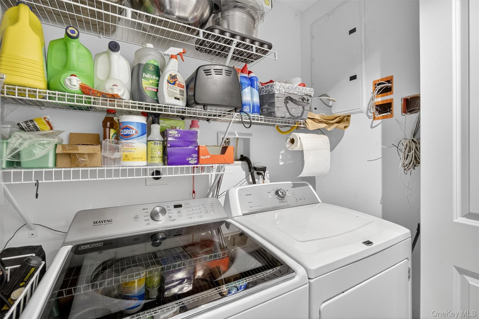 - Laundry area featuring a washer, dryer and shelving for all your products.
