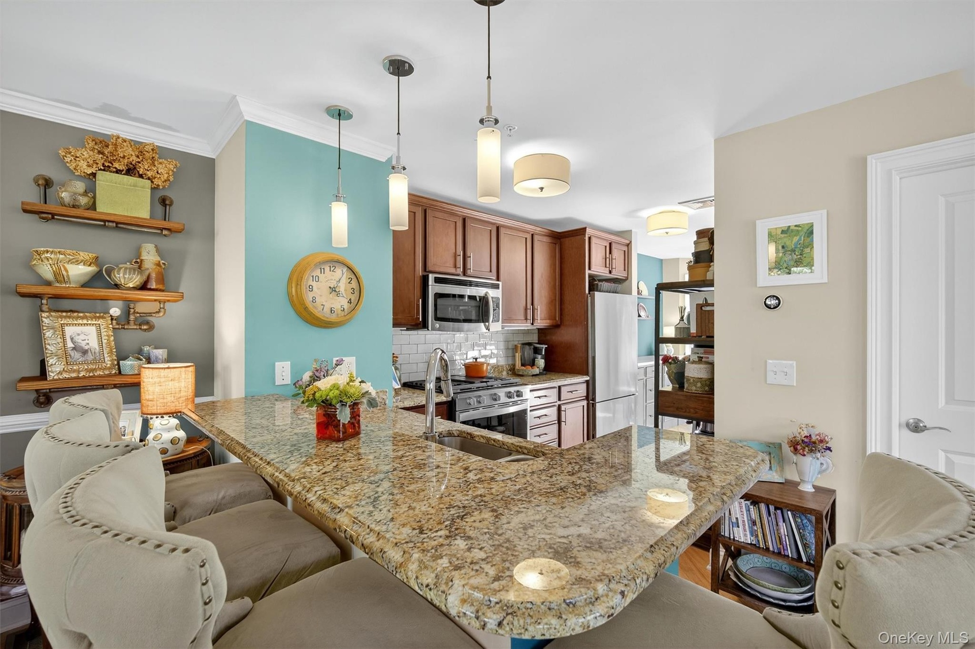 - The kitchen offers granite countertops, stainless steel appliances and a large counter with seating.